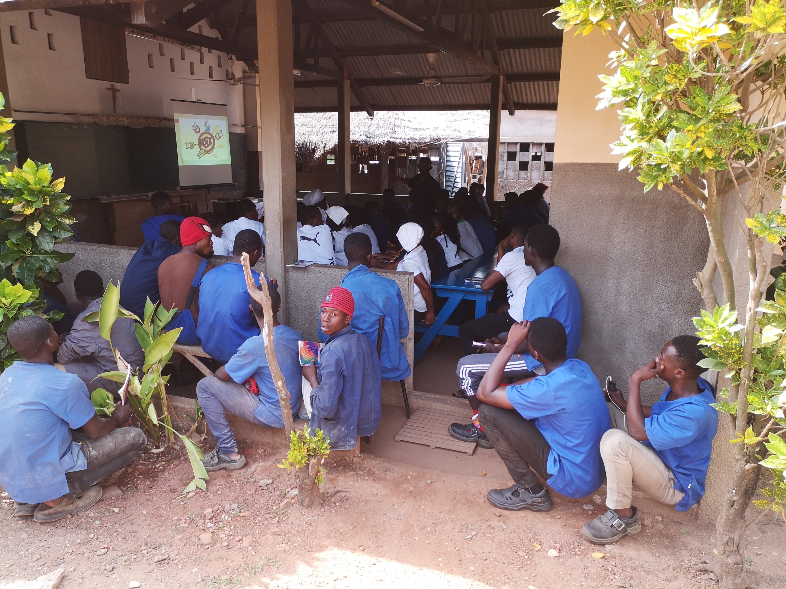 Im Ausbildungszentrum findet heute Nachmittag für die Azubis eine Gesundheitsschulung statt. Nicht nur im Schulsaal, sondern auch auf dem Platz davor sitzen die Jugendlichen dicht gedrängt.