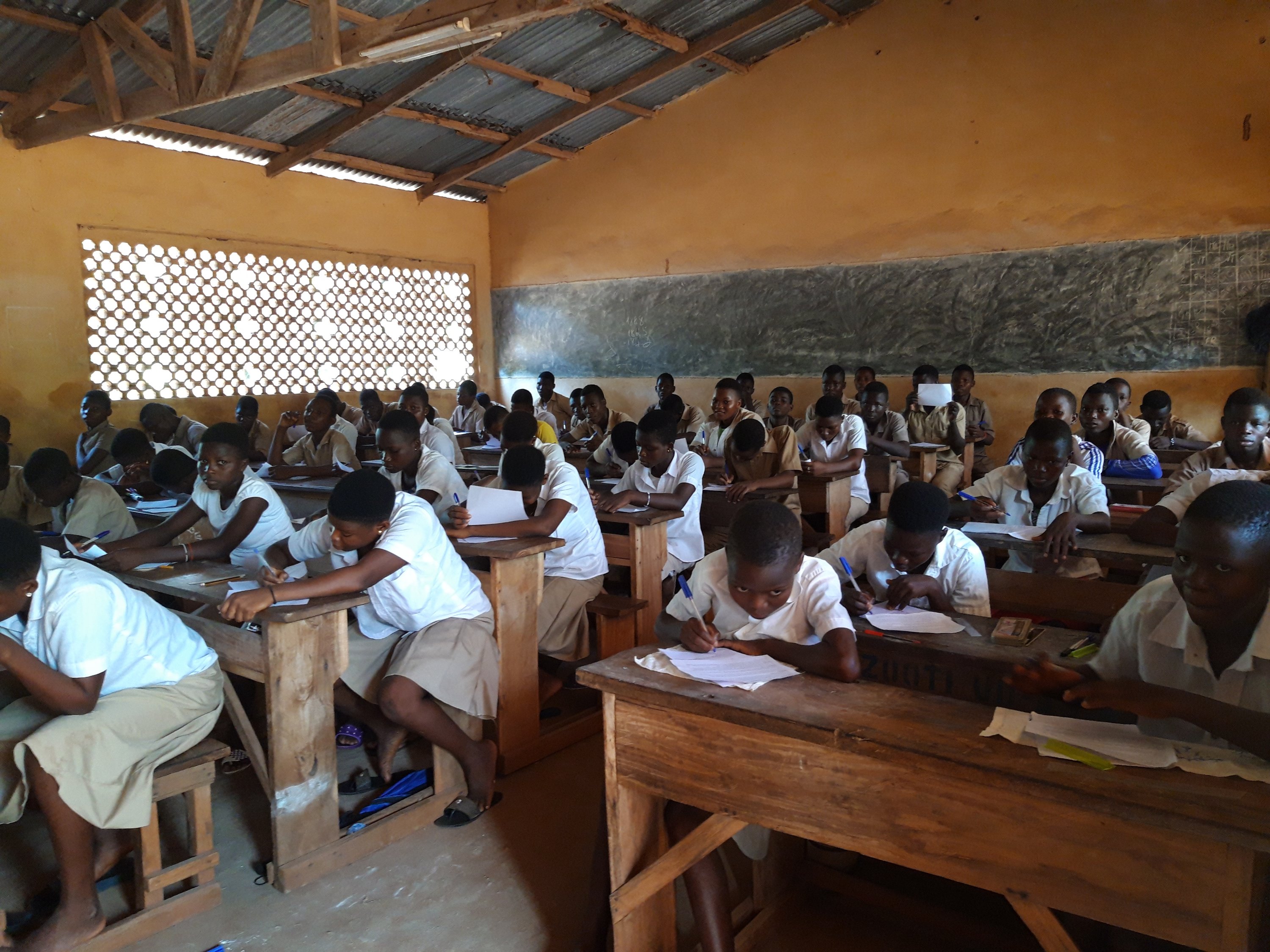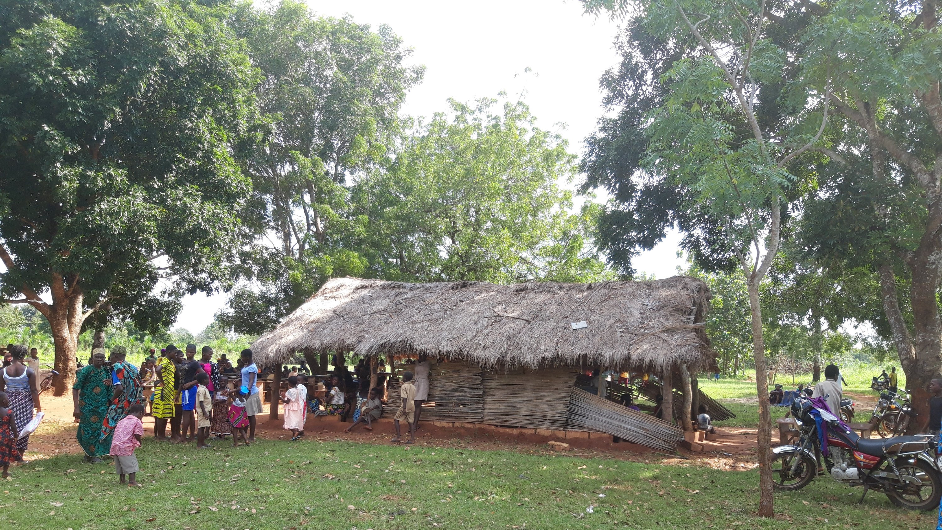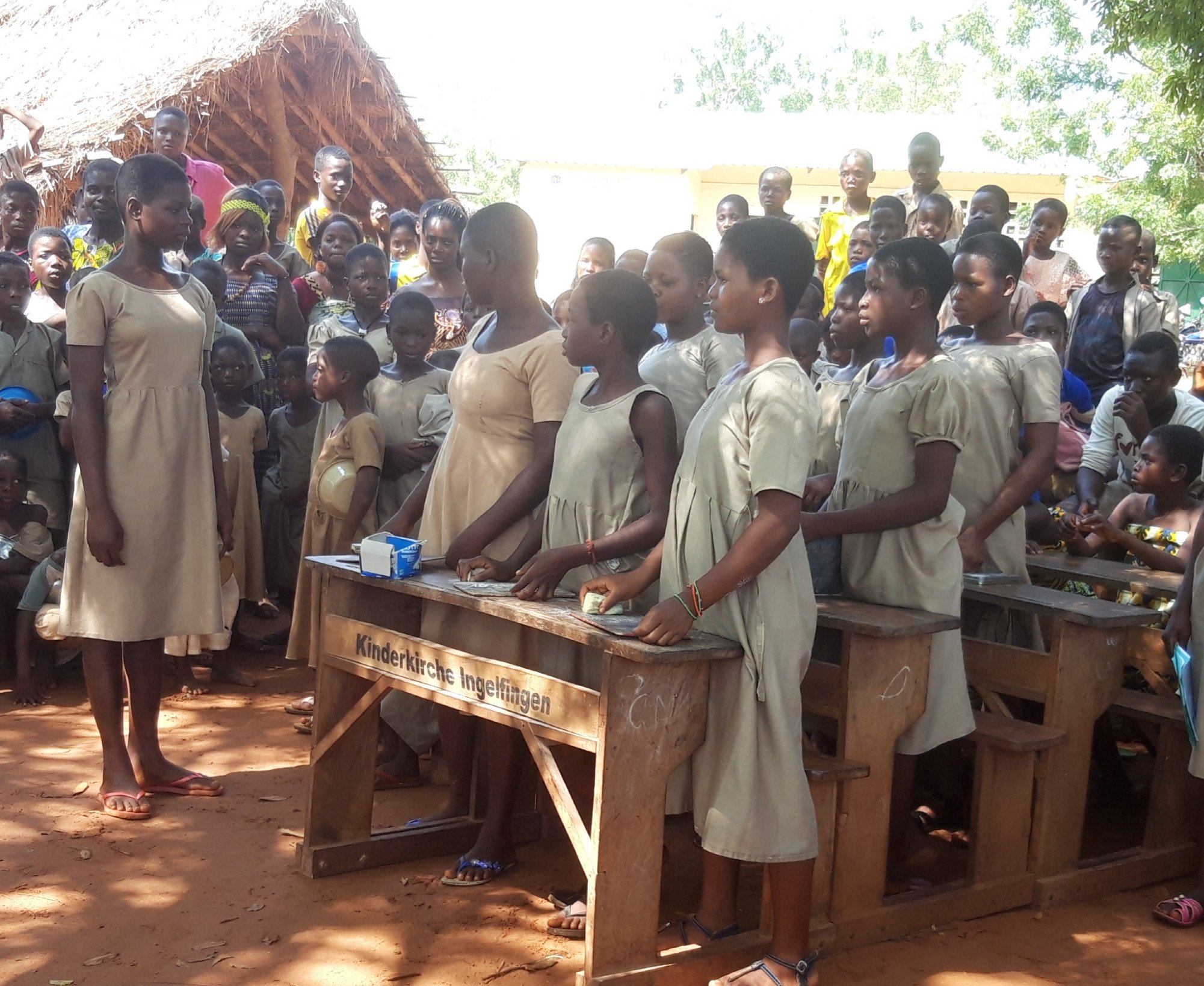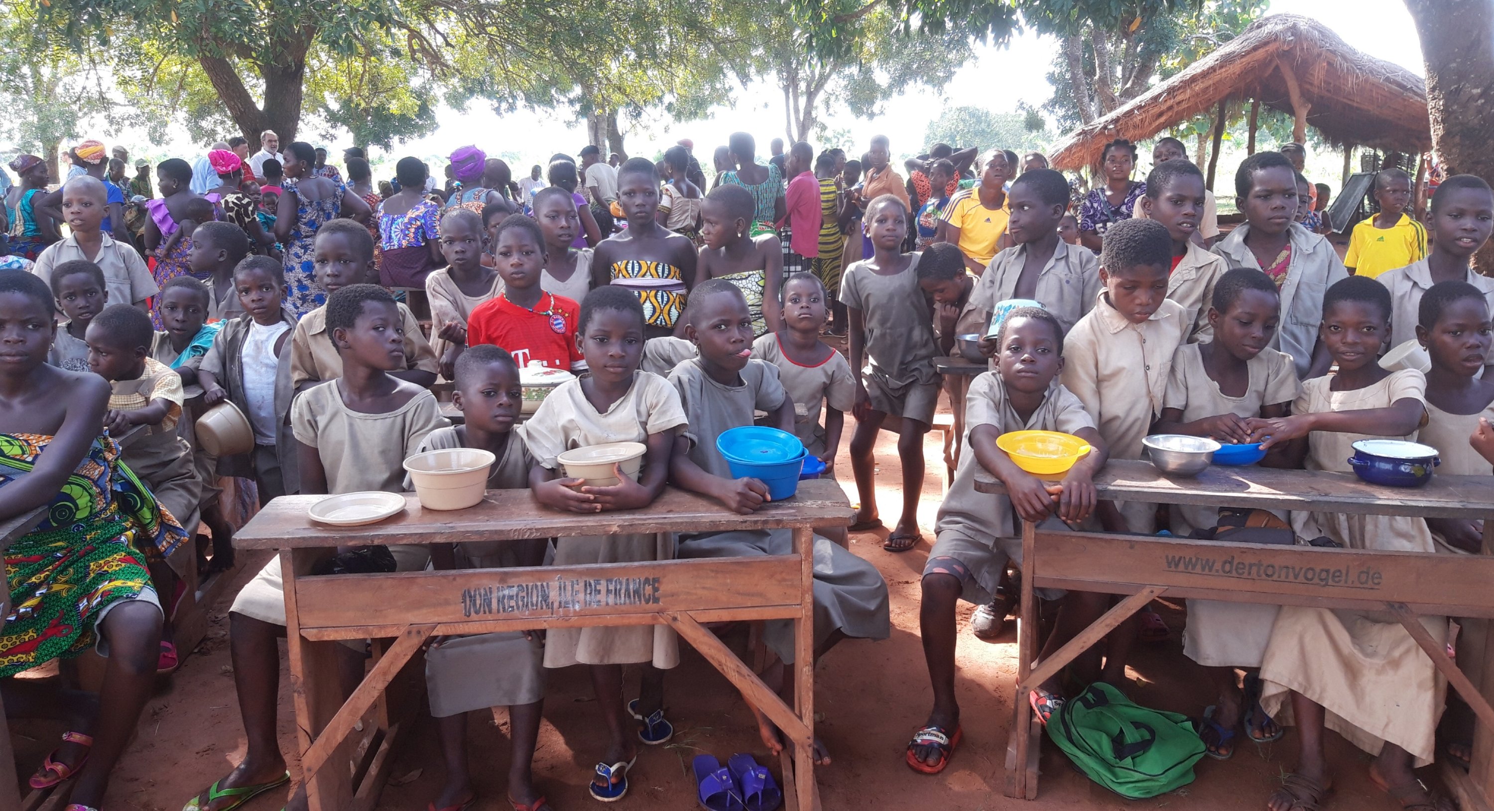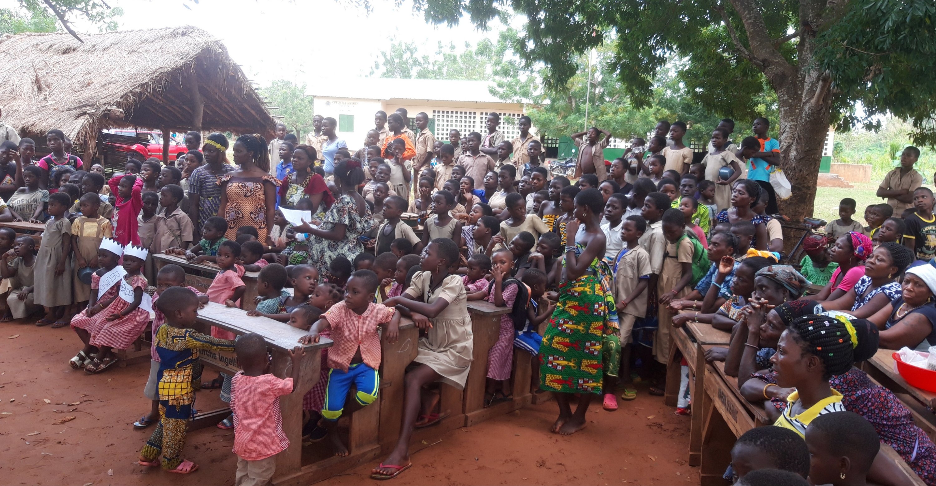 Auf dem großen Platz vor der Schule sind alle verfügbaren Schulbänke aufgestellt. Es sieht aus als wäre die gesamte Dorfbevölkerung da.