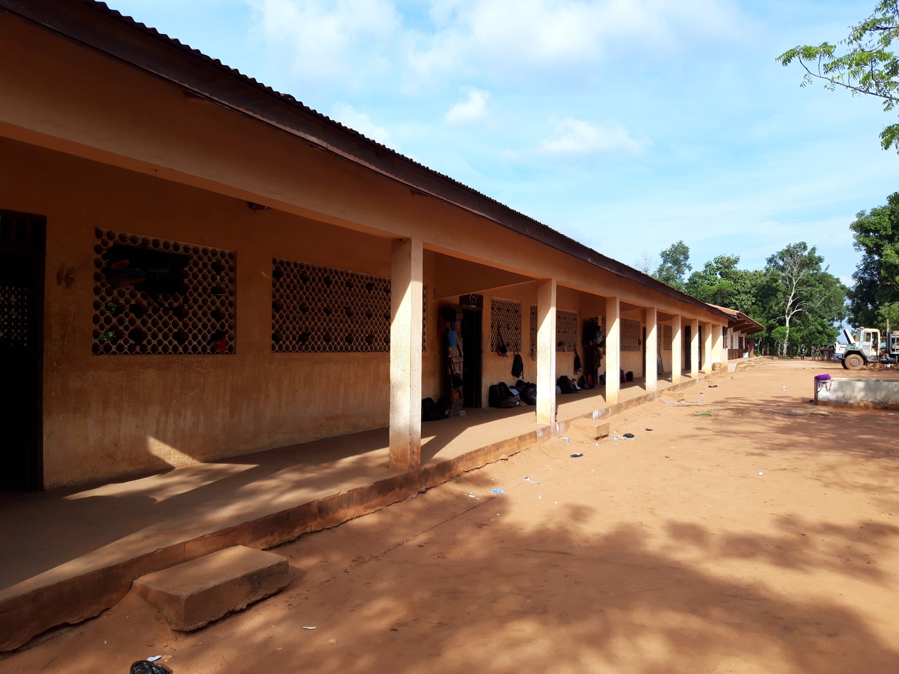 Durch den vielen Regen stehen ganze Landstriche unter Wasser. Viele Hütten sind unbewohnbar und es wurden Notzelte aufgestellt. Auf der Fahrt machen wir noch einen Umweg über Klologo. Von der dortigen Schule kam auch ein Antrag für einen Schulbau. Wir besichtigen die Gebäude. Ganz neu ist ein Schulgebäude, dass erst vor kurzem eingeweiht wurde. Im Moment wir gerade von einer dänischen Firma ein Brunnen gebohrt.