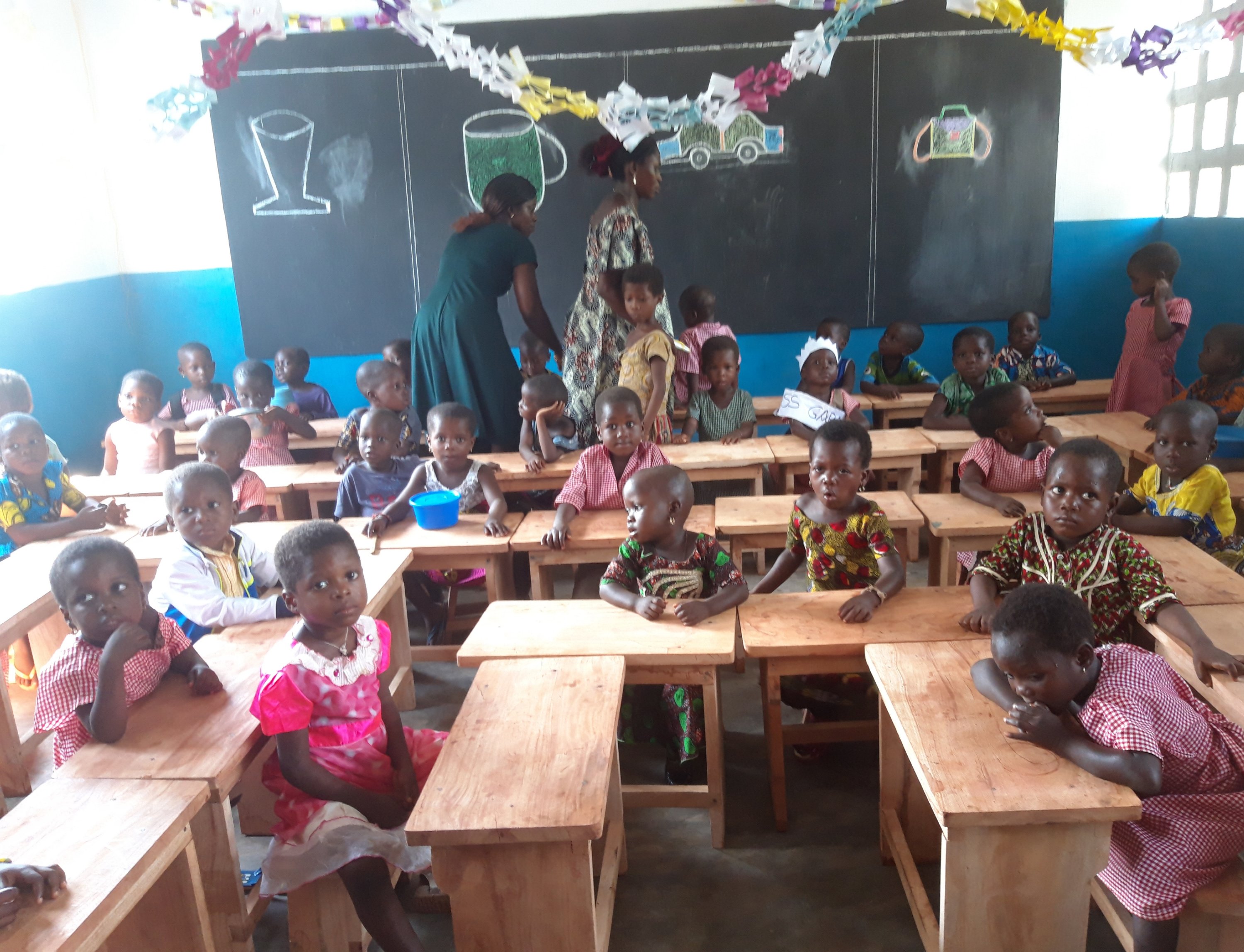Mit Girlanden und bemalten Tafeln, haben die Erzieherinnen den Raum schön hergerichtet. Es ist nur kaum Spielzeug vorhanden. Wir versprechen im nächsten Container etwas mit zu schicken.