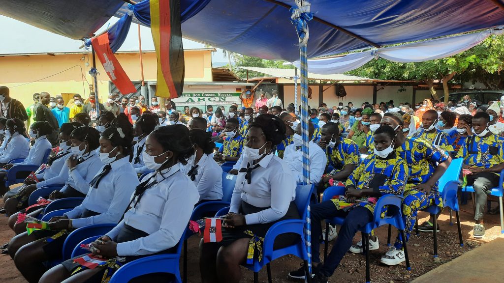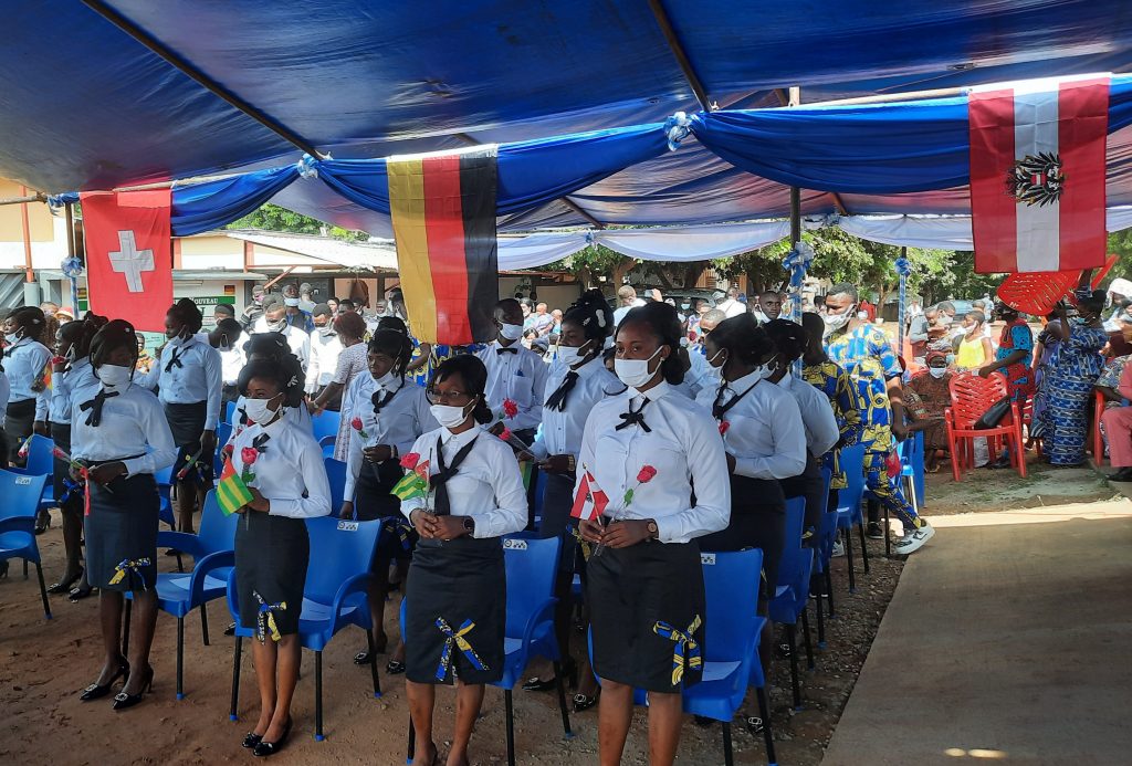 Gefühlt 1000 Menschen in wunderschönen, bunten afrikanischen Kleidern füllen den Platz vor dem Ausbildungszentrum. Von den Lehrlingen sind die ganzen Familien gekommen und freuen sich, dass ein Kind aus ihrer Familie heute eine qualifizierte Berufsausbildung abschließen kann. Die Absolventen sind heute besonders festlich herausgeputzt. Alle Mädchen waren beim Friseur und haben kunstvolle Haarprachten und prächtigen Schmuck. Die Lehrlinge aus dem Bereich Gastronomie sind in schwarz – weiß gekleidet – die Jungs mit einer Fliege und Einstecktuch und die Mädchen eine Schleife am Rock. Die Lehrlinge aus dem handwerklichen Bereich tragen alle die gleichen Hemden aus einem afrikanischen Stoff. Auch die Ausbilder tragen alle ein Hemd im selben afrikanischen Design.
