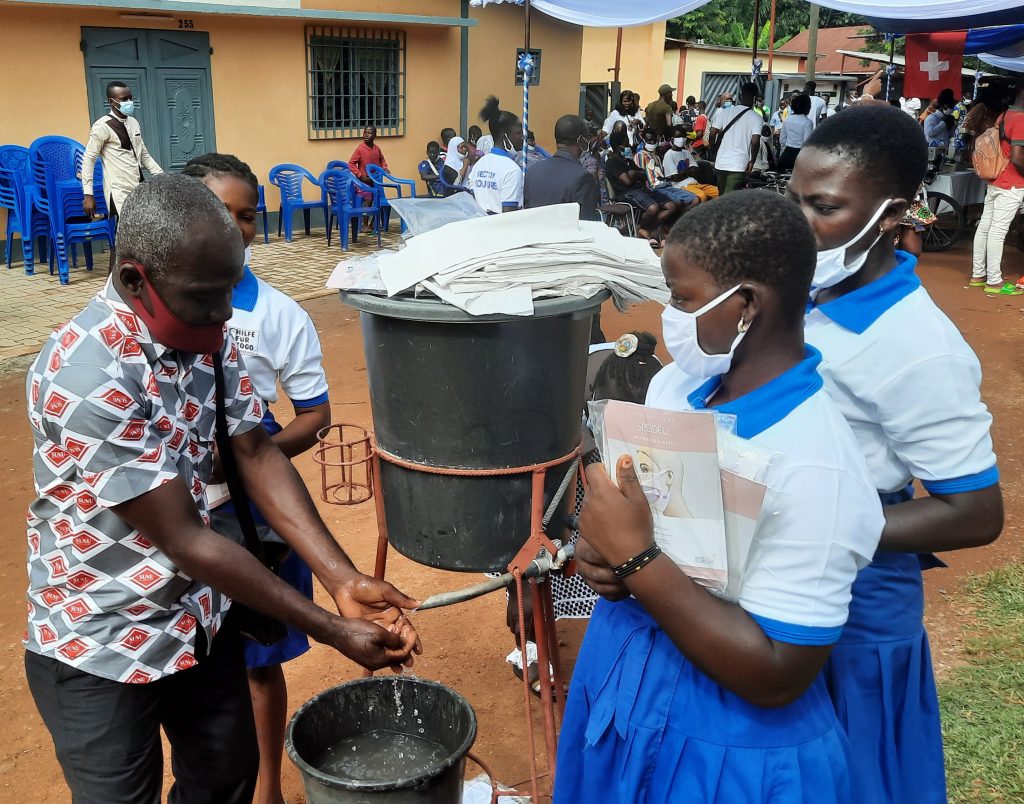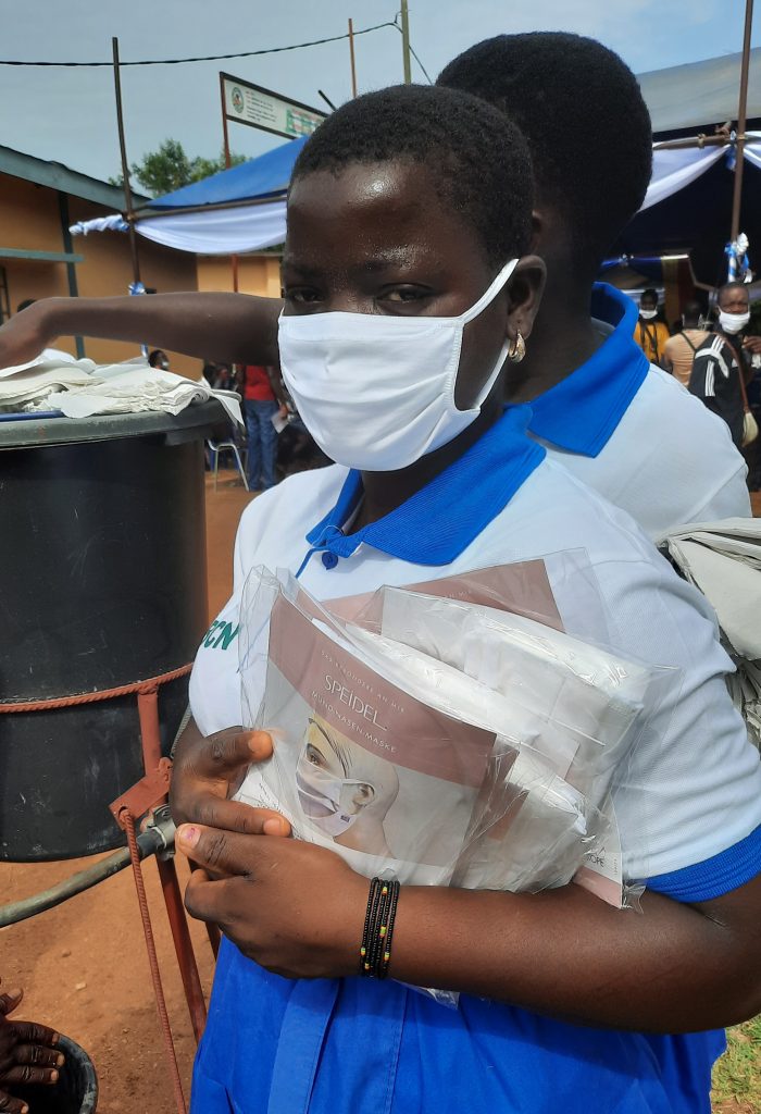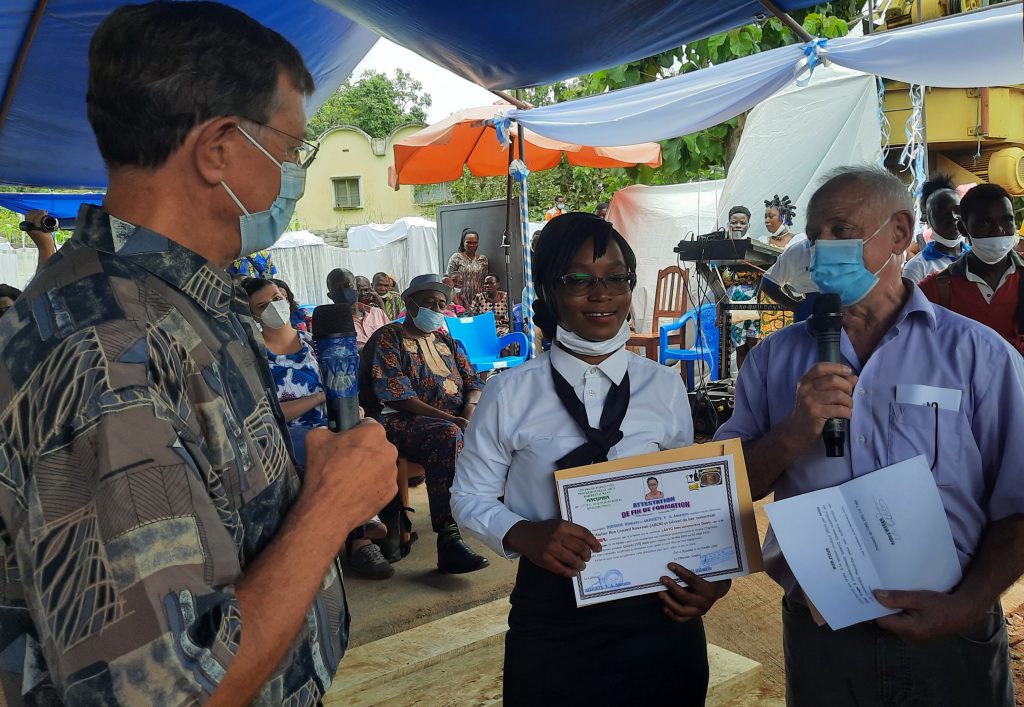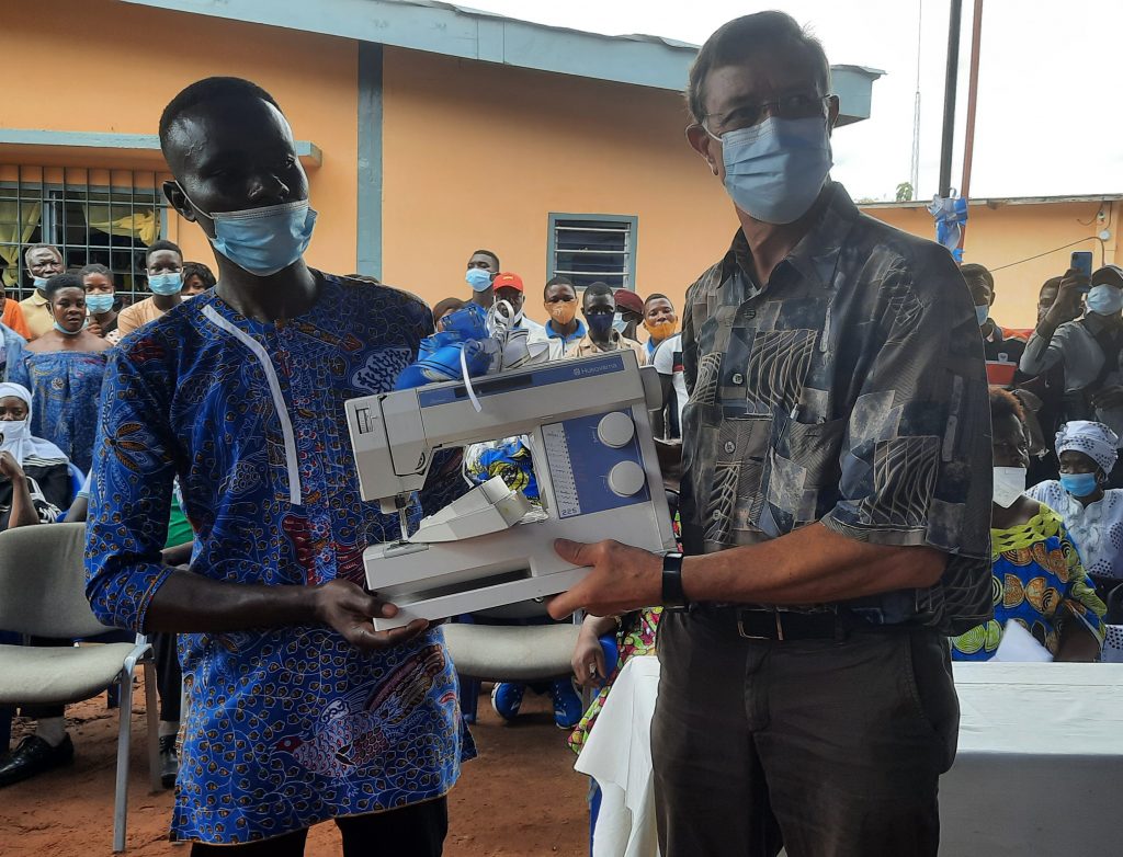 Gleichzeitig übergeben Anton Weber und Leon Djossou an Gisele Lanyo, die Gewinnerin des großen Kochwettbewerbes einen Gutschein, mit dem sie sich in der Schneiderei des ABCN einen Stoff aussuchen darf und sich ein Kleid nähen lassen kann. Sie freut sich sehr darüber und bereits 2 Tage später kann sie ihr Kleid abholen.