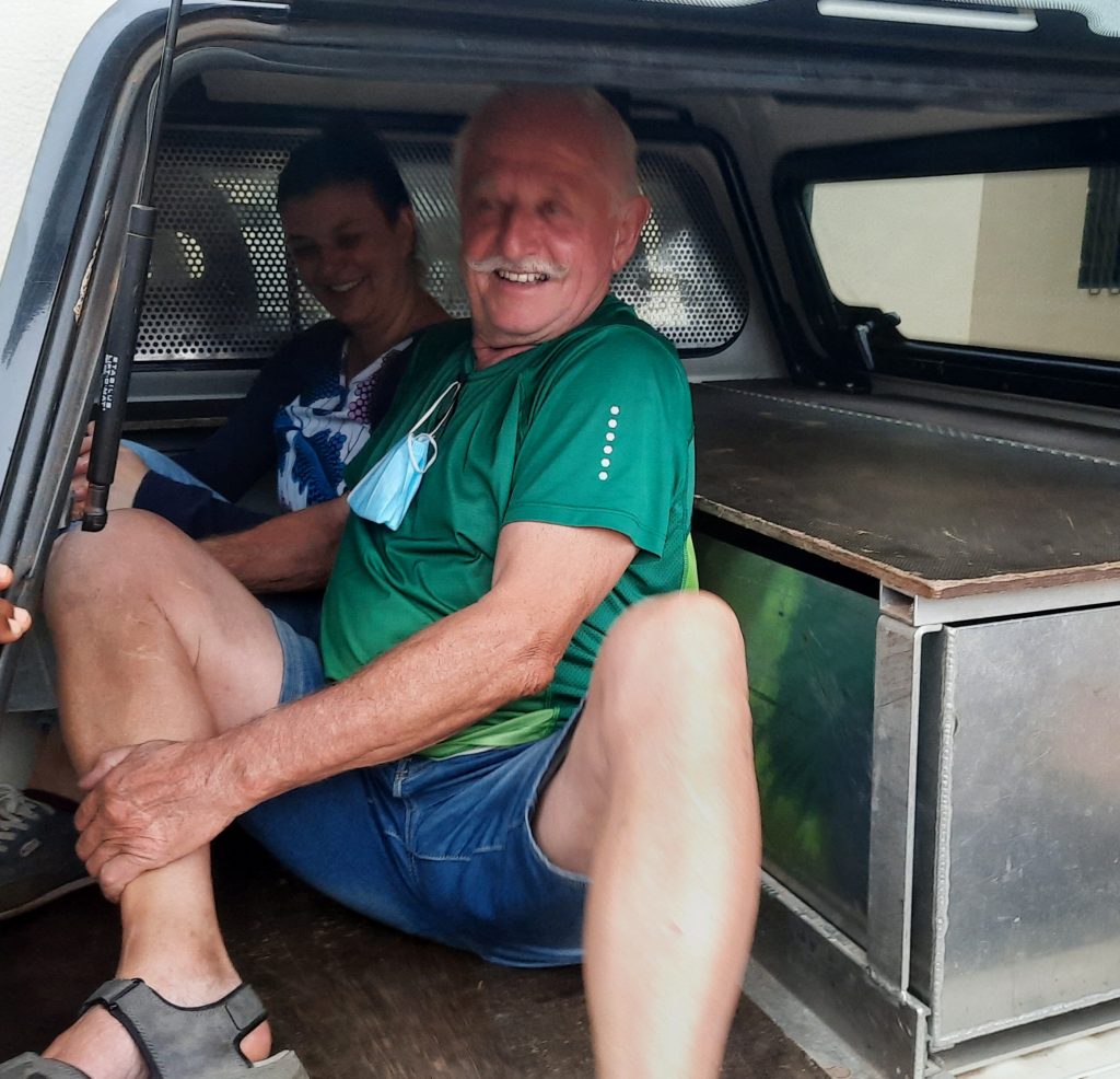 Da Amelie und Holalie in Lome sind um die Koffer von Johanna und Hubert zu holen haben wir nur ein Auto… Johanna und Done nehmen im Kofferraum Platz ….