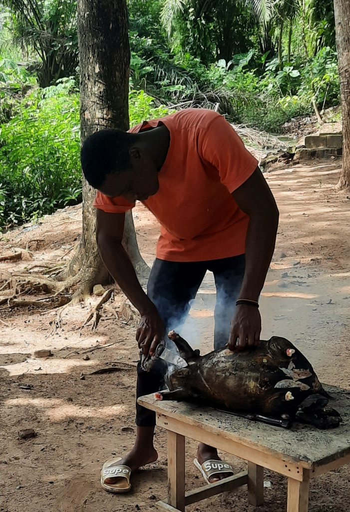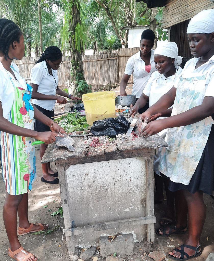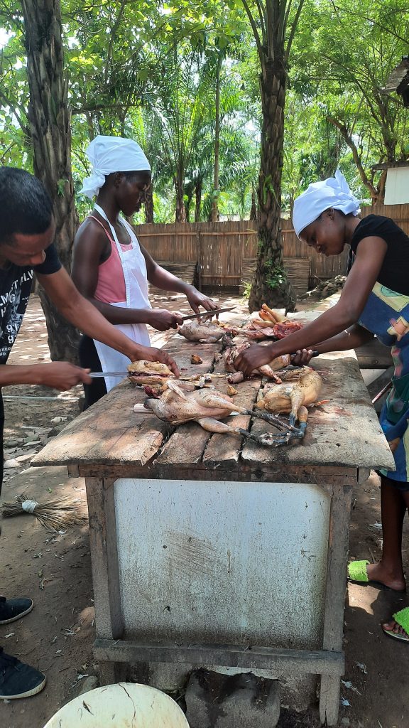 Die Lehrlinge im Küchenbereich lernen nicht nur das Kochen sondern auch das Schlachten und küchenfertig machen der Tiere, wie Ziegen, Hühner, Perlhühner und Fische.