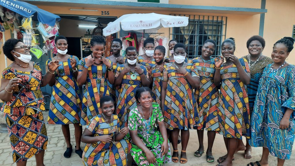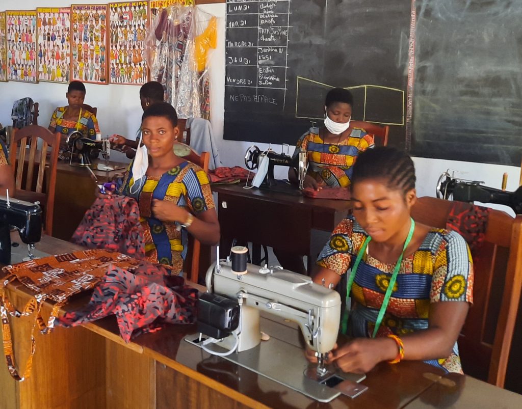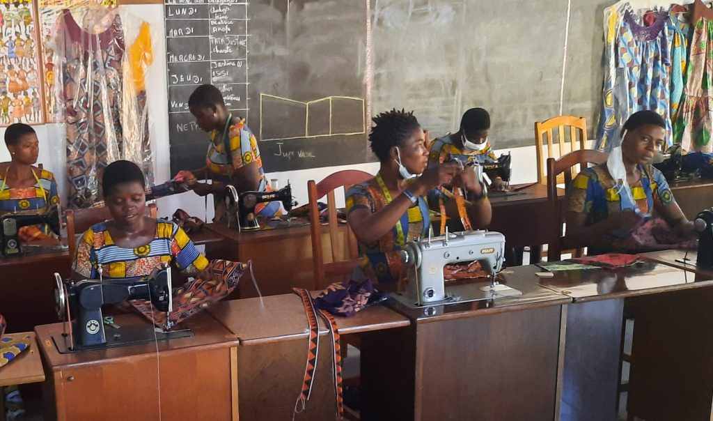 In der Schneiderei sind zur Zeit 12 Mädchen in der Ausbildung.Mit unseren Hilfscontainern schicken wir regelmäßig Stoffe und Nähzubehör. Victorin erzählt uns, dass sie dafür sehr dankbar ist. In vielen Schneidereien lernen die Mädchen mit alten Zementsäcken das Nähen. Wenn sie dann mal mit Stoff nähen dürfen, haben sie Angst das es nicht gelingt. Die afrikanischen Stoffe sind teuer und somit zu schade zum üben. Die Sachen, die die Mädchen aus unseren Stoffen nähen dürfen sie dann behalten. Die Schneiderei wurde vor einem Jahr eröffnet. Davor hat Victorin bei sich im Haus eine kleine Schneiderei.