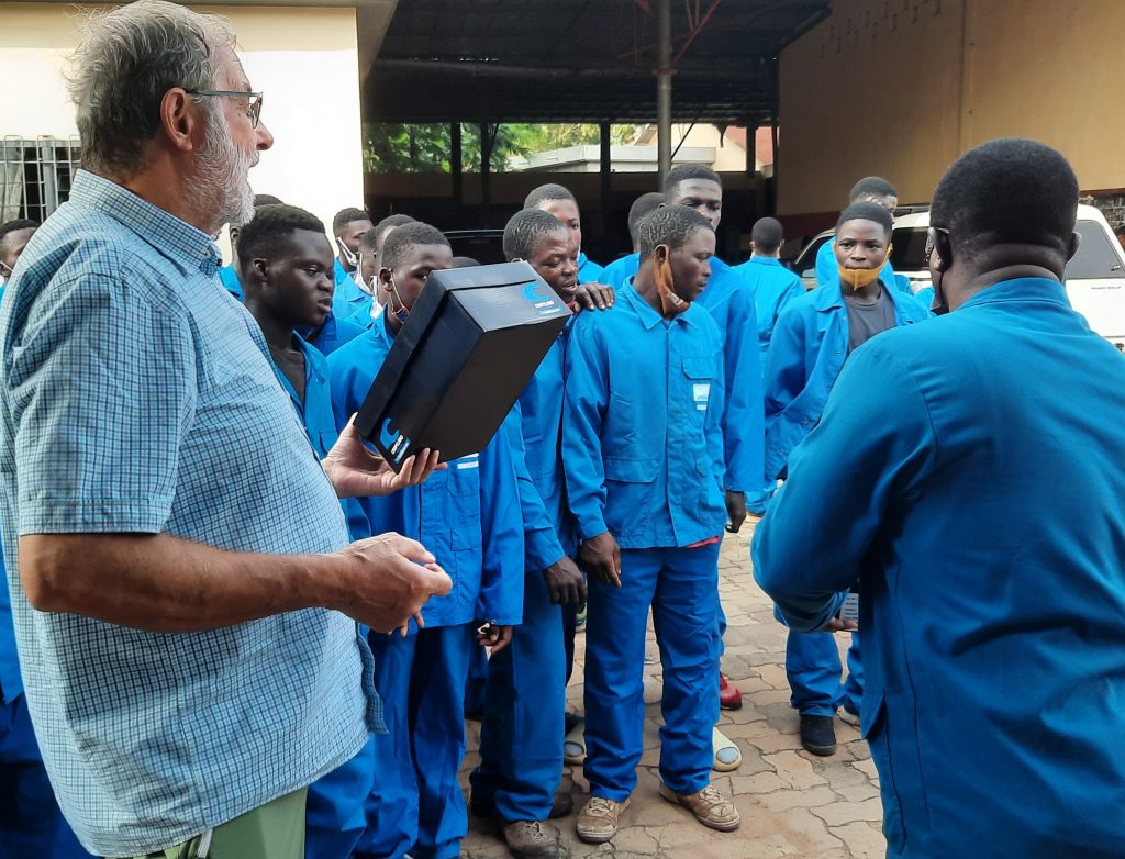 Sehr oft sieht man die Azubis mit Flip Flops am Arbeitsplatz. Schon öfters gab es deshalb Sicherheitsschuhe aus dem Container. Diesmal stammten sie aus dem Container des Lions Club Sierning in Österreich. Die Jungs waren ganz aus dem Häuschen über das tolle Arbeits Outfit.