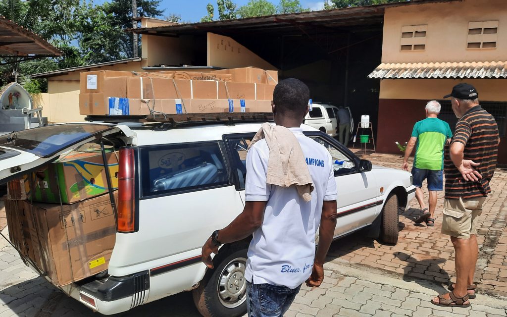 Jetzt werden die Autos beladen und wir fahren aufs Plateau de Day, mit dabei viele Pakete aus dem Container.