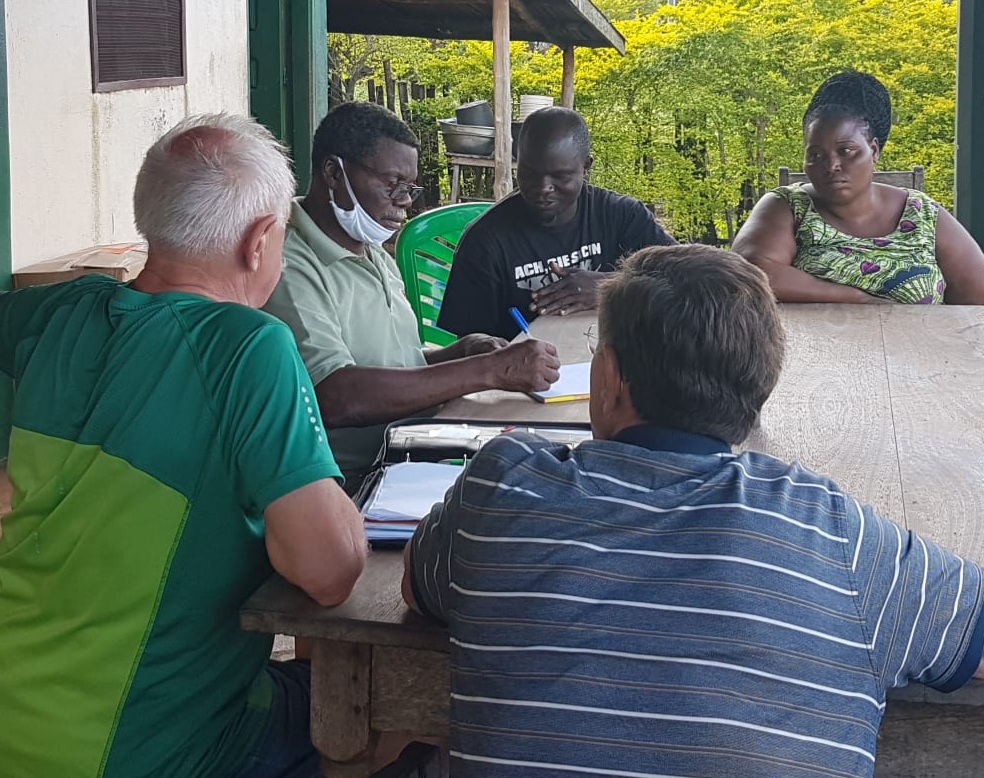 Anton, Roman und Leon besprechen mit Julie und Ameniyo den Jahresabschluß. Zwei weitere Streifen sollen bepflanzt werden mit Avocado, Mango und Kakao. Die Landarbeiter werden demnächst mit den Vorbereitungen des Landes beginnen und dann zu Beginn der nächsten Regenzeit die Bepflanzung starten.