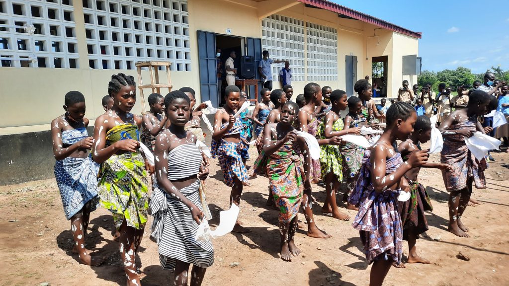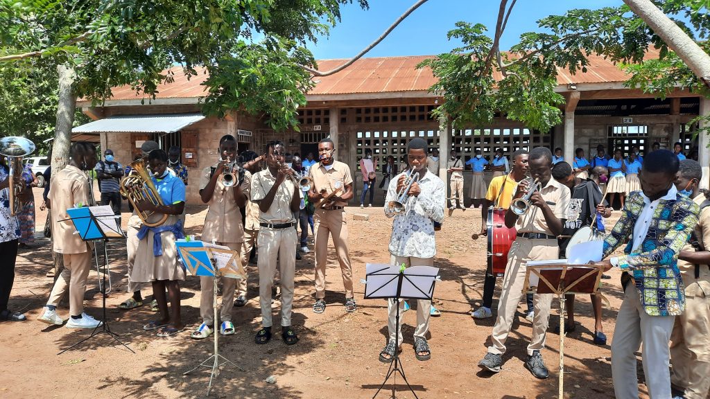 Der Empfang an der Schule ist phänomenal. Selbst wir, die wir schon so oft in Togo waren sind absolut gerührt. Links und rechts der Zufahrt zur Schule stehen die Schüler und winken mit Fähnchen. Der absolute Hammer ist eine Bläser – Trommelgruppe. Sie spielen Musik, die Fähnchenschwinger singen und mit viel Hallo werden wir durch das Spalier zu unseren Plätzen begleitet.