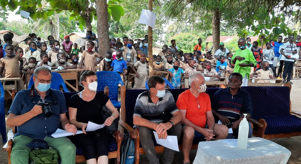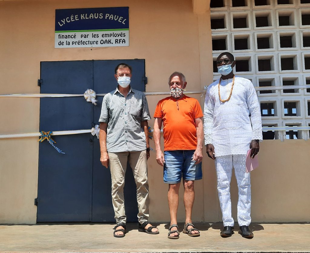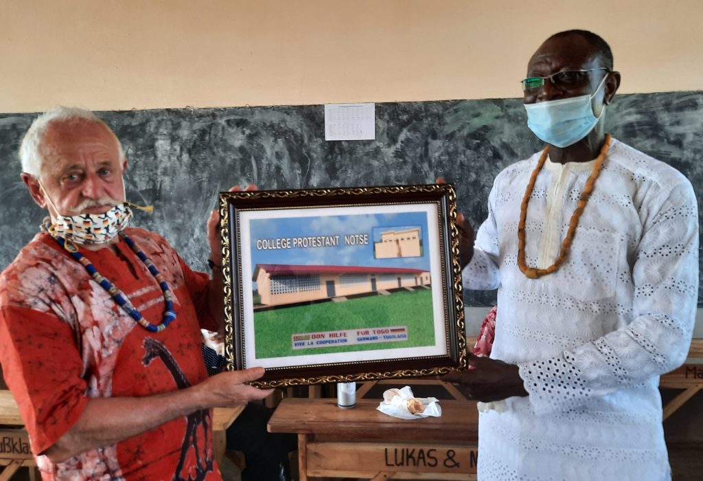 Der Direktor hält eine sehr emmotionale Rede. Er sagt, dass es für ihn eine große Ehre ist uns im Namen aller Lehrer, Schüler und Eltern der evangelischen Schule begrüßen zu dürfen. Er heißt und ganz herzlich willkommen und hofft, dass wir uns wie zu Hause fühlen. Das Lycee wurde im September 2012 gegründet. Zuvor mussten die Schüler extrem weite Wege zu anderen Schulen zurücklegen. Er erläutert, dass es der Evangelisch – Presbyterianischen Kirche in Togo ein großes Anliegen ist, trotz der begrenzten Mittel den Kindern und Jugendlichen die bestmögliche Bildung zu ermöglichen. Bei der Gründung waren es 2 Klassen mit wenigen Schülern. Inzwischen sind es 14 Klassen. Wenn die Einschränkungsmaßnahmen (Abstandsregeln) auf Grund von Covid 19 aufgehoben werden, kann die Schülerzahl noch erhöht werden. Der Zuwachs der Schüler war größer als zu Beginn erwartet. So mussten zu Beginn des Schuljahres 2018/19 Schüler in einem Behelfsgebäude untergebracht werden. Der Direktor sagt, sie hätten Schmerzenschreie ausgerufen und diese wurden in Deutschland erhört und es wurde ein schönes Gebäude mit 4 Klassenräumen erbaut. Natürlich komplett ausgestattet mit Schulbänken, Tische für die Lehrer und die Einrichtung für das Büro der Sekretärin und des Direktors. Außerdem wurde eine Latrine gebaut. In der Schule gab es bisher kein WC. Die Schule wurde nach Klaus Pavel benannt und alle danken ihm und allen Mitarbeitern des Ostalbkreises für dieses unschätzbare Juwel von großem Wert. Mit dem Gebäude wird die Leistungsfähigkeit der Lernenden erhöht und bietet hervorragende Bedingungen für Schüler und Lehrer. Die Ergebnisse bei den Abschlussprüfungen werden sich verbessern. Die Schule ist zu einer renommierten Bildungseinrichtung geworden und die Bevölkerung von Notse und die Evang. – Presbyterianische Kirche ist sehr stolz darauf. Auf Grund des neuen Gebäudes wurde die Schule zum regionalen Prüfungszentrum ernannt. Zu den Abschlußprüfungen kommen Schüler aus anderen Orten. Der Rektor meint, in diesen schönen Gebäude mit dem angenehmen Raumklima ist es besser Prüfungsarbeiten zu schreiben.