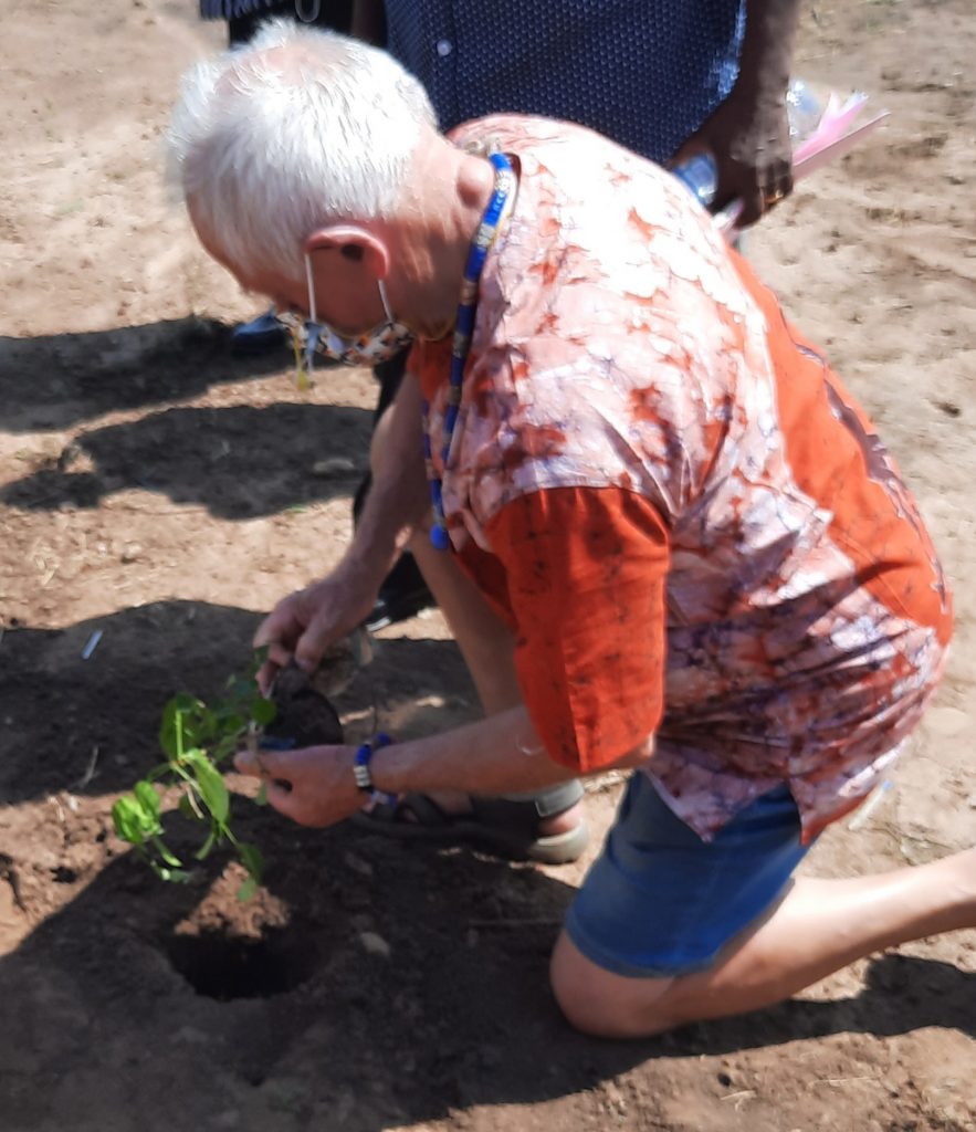 Auf dem weitläufigen Gelände wurden in den letzten Jahren schon fast 1000 Bäume gepflanzt. Zur Feier des Tages darf Done auch einen Baum pflanzen. Es ist ein Baum, der aus Senegal stammt und ein hartes Holz liefert, aus dem die Schulbänke hergestellt werden.