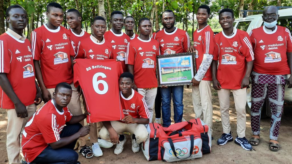 Wir überreichen noch Trikots von der SG Bettringen und da sind die Jungs der Fußballmannschaft total happy.