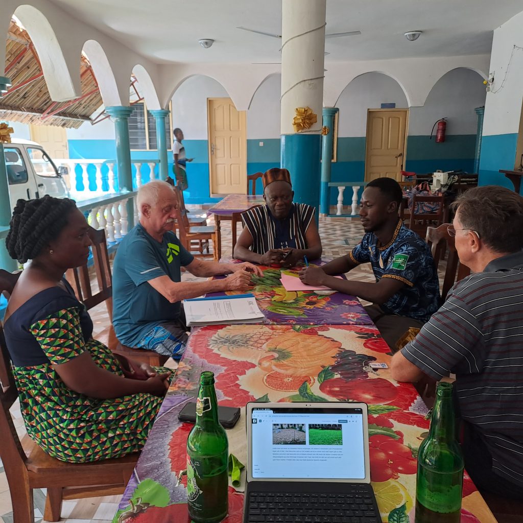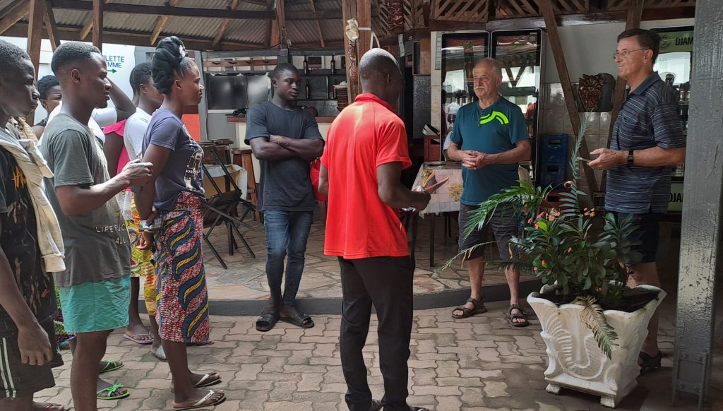 Nach dem Frühstück gehen wir gleich ins Hotel um unsere Koffer zu packen. Aus dem Büro des ABCN kommen noch die Sekretärin Afi, Kokou Aboutsi und Arafat. Sie haben noch einige Unterlagen dabei, von den Abrechnungen der Projekte des vergangenen Jahres, die Anton unterschreiben muss. Leon wird mit den gesamten Unterlagen am Montag gleich zur oberen Finanzbehörde nach Lome gehen und unseren Jahresabschluss abgeben. Die drei Hauptakteure unseres Büros in Togo haben gute Arbeit geleistet. Sie verabschieden sich von uns nicht ohne sich für unser Engagement zu bedanken. Auch wir bedanken uns bei ihnen für die tolle Arbeit. Bei seinen Abschlußworten sagt Anton, dass wir alle stolz sein können auf das Erreichte und das es nur so gut funktioniert, weil wir alle in Togo und Deutschland an einem Strang ziehen.