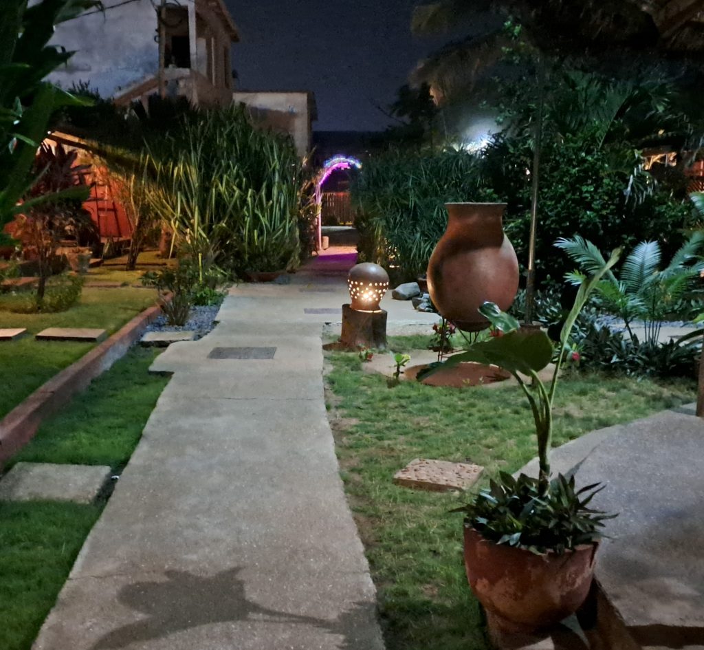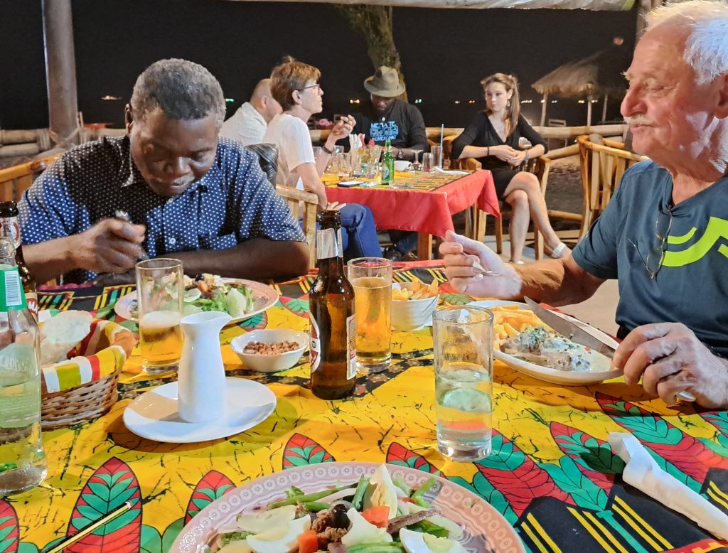 Inzischen wird es schon dunkel und wir fahren zum Robinson plage und werden dort eine letzte Nacht verbringen. Schon der Parkplatz ist rappelvoll und ebenso das Restaurant. Gut das Leon die Zimmer vorbestellt hat, sonst kämen wir hier nicht unter. Wir habn heute Glück. Im Restaurant ist ein Treffen von Archäologen die eine Powerpoint Präsentation über Ausgrabungen in Bassar haben. Bassar liegt am Rande der Atakora Berge und dort fanden schon1885 Ausgrabungn durch deutsche Kolonialherren statt. Wir verstehenzwar nicht alles, es ist aber trotzdem interressant.