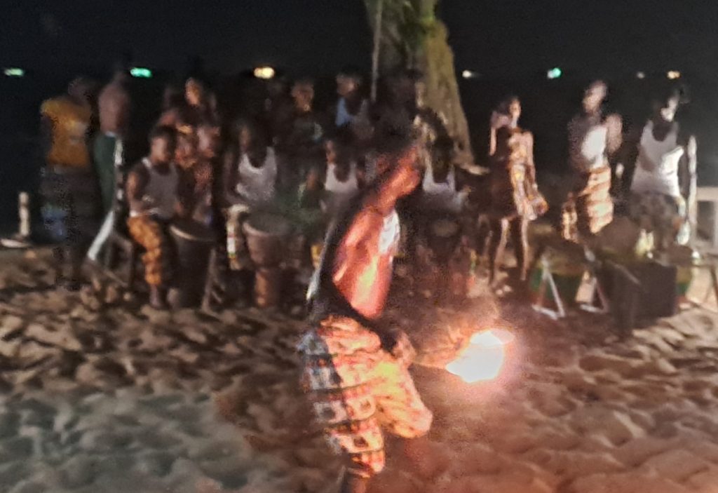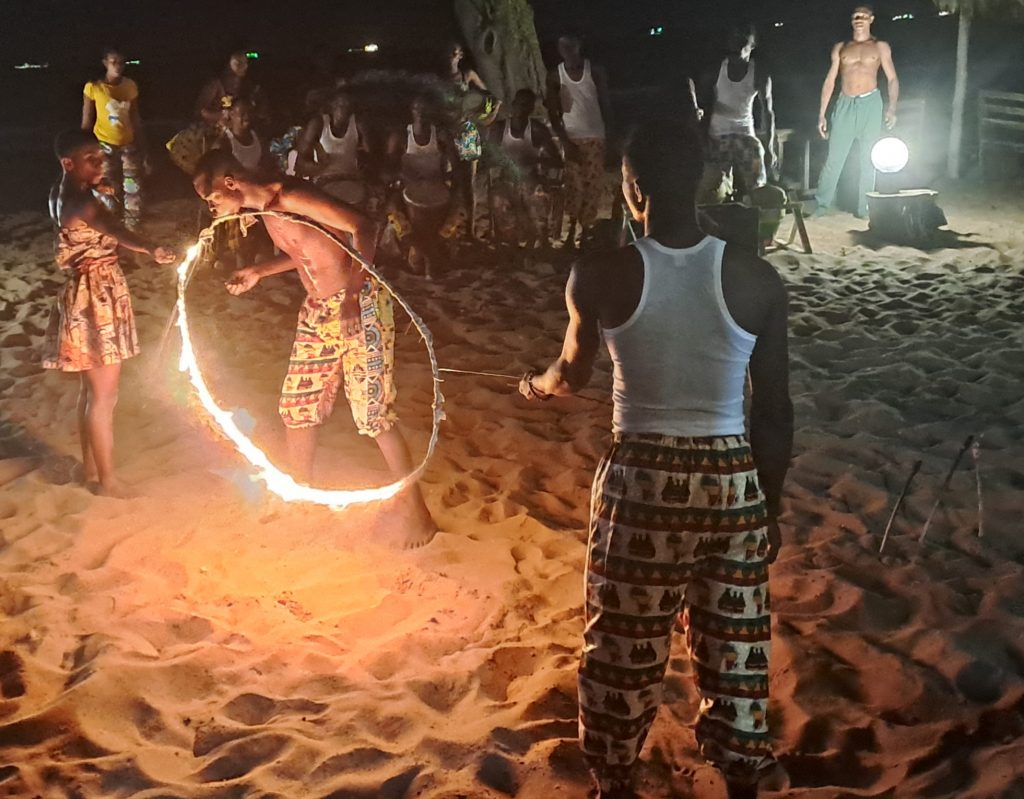 Nach dem Essen tritt dann noch ein Trommel-Tanzgruppe auf, die auch einen Feuerspucker dabei haben und so wird es ein schöner letzter Abend.