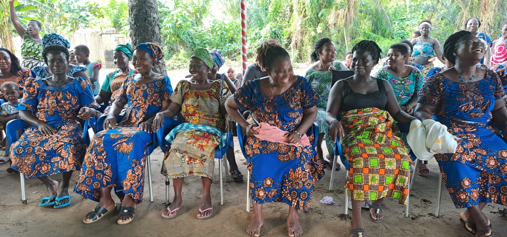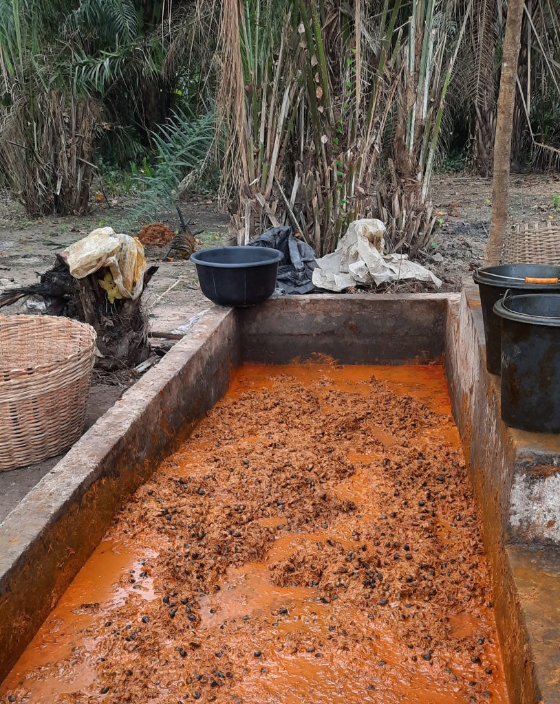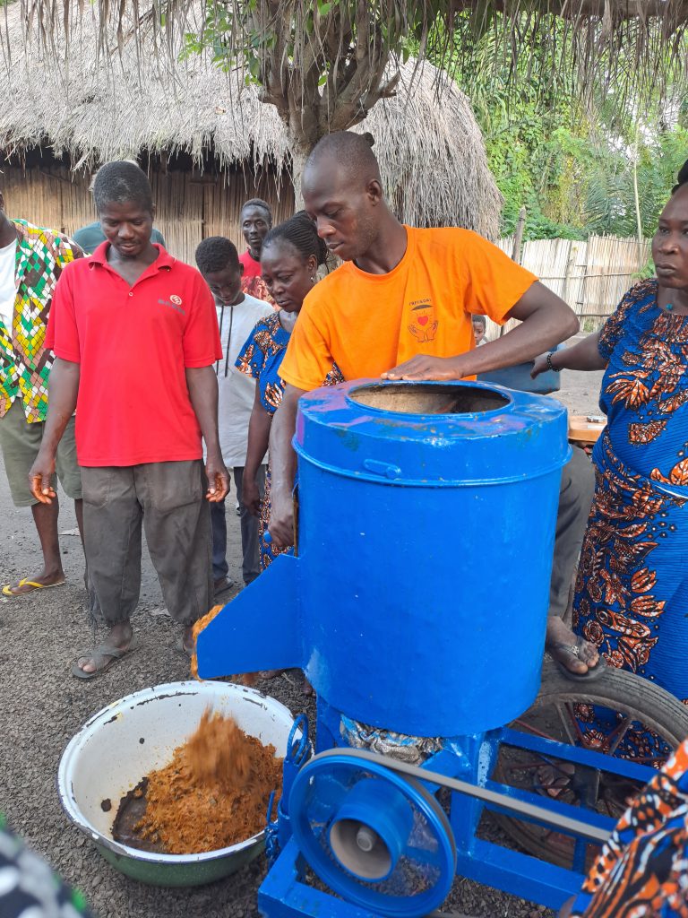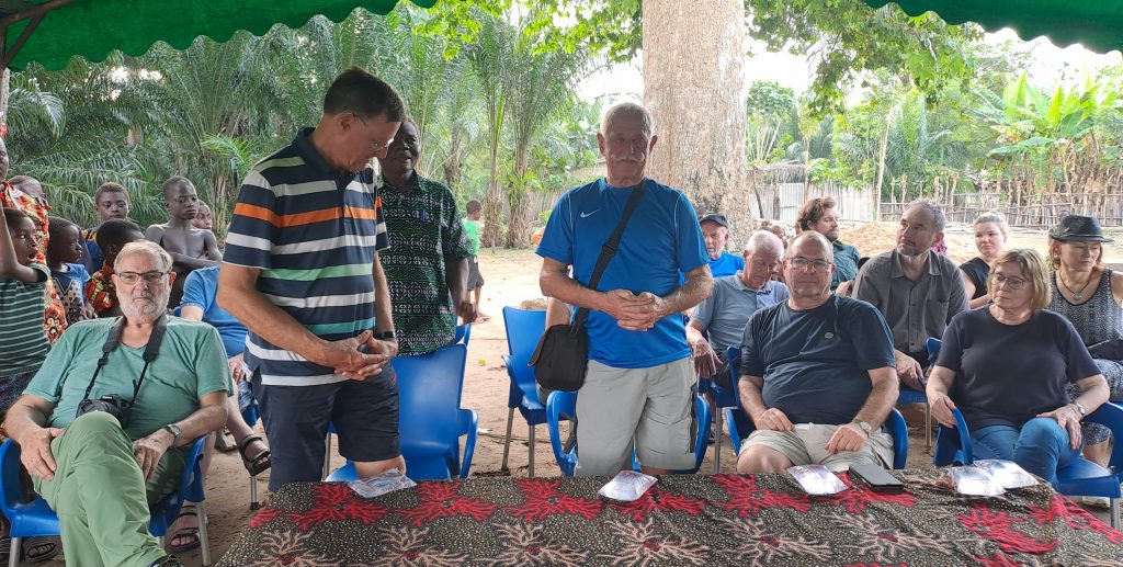 Vor einigen Jahren bekamen die Frauen kaum einen Erlöß für ihr Öl u. es ließ sich schlecht verkaufen. Zu der Zeit sind die Frauen dann zur Seifenproduktion übergegangen. Was vor allem zu Beginn der Coronazeit einen sehr guten Ertrag brachte. Jetzt ist der Preis enorm gestiegen und die Frauen verkaufen das Öl und die Palmkerne direkt. Noch besser wäre es wenn die Frauen das rote Öl und die Kerne für das weiße Öl nicht direkt nach der Ernte vekaufen würden, sondern erst in 5 – 6 Monaten, da bis dahin der Preis nochmal steigt. Dazu bräuchten sie aber einen Lagerraum. Wir haben schon mehrmals darüber gesprochen und versprechen im kommenden Jahr nach Spendern für den Bau eines kleineren Maganzins zu schauen. Nach diesem eindrucksvollen Nachmittag verabschieden wir uns, denn bei Victorine werden wir schon zum Abendessen erwartet