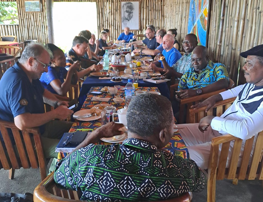 Das Frühstück ist herrlich und gleichzeitig auch unser erster offizieller Termin. Leon hat Mitglieder des Lionsclub Novissi – Lome zu einem Gespräch eingeladen. Der Lionsclub Sierning möchte zusammen mit dem Lionsclub Aalen und Lions International ein neues Projekt starten. Dabei soll bei unserem Ausbildungszentrum ABCN eine Schulküche gebaut werden. Neben der Ausbildung der Lehrlinge vom Macumba, sollen dort auch Schulungen für die Frauen, die für die Schulkinder kochen stattfinden und das tägliche Mittagessen für unsere Lehrlinge vom ABCN gekocht werden. Die Gespräche verlaufen sehr angenehm und es scheint als würde die Zusammenarbeit mit diesem Lionsclub ganz gut funktionieren.