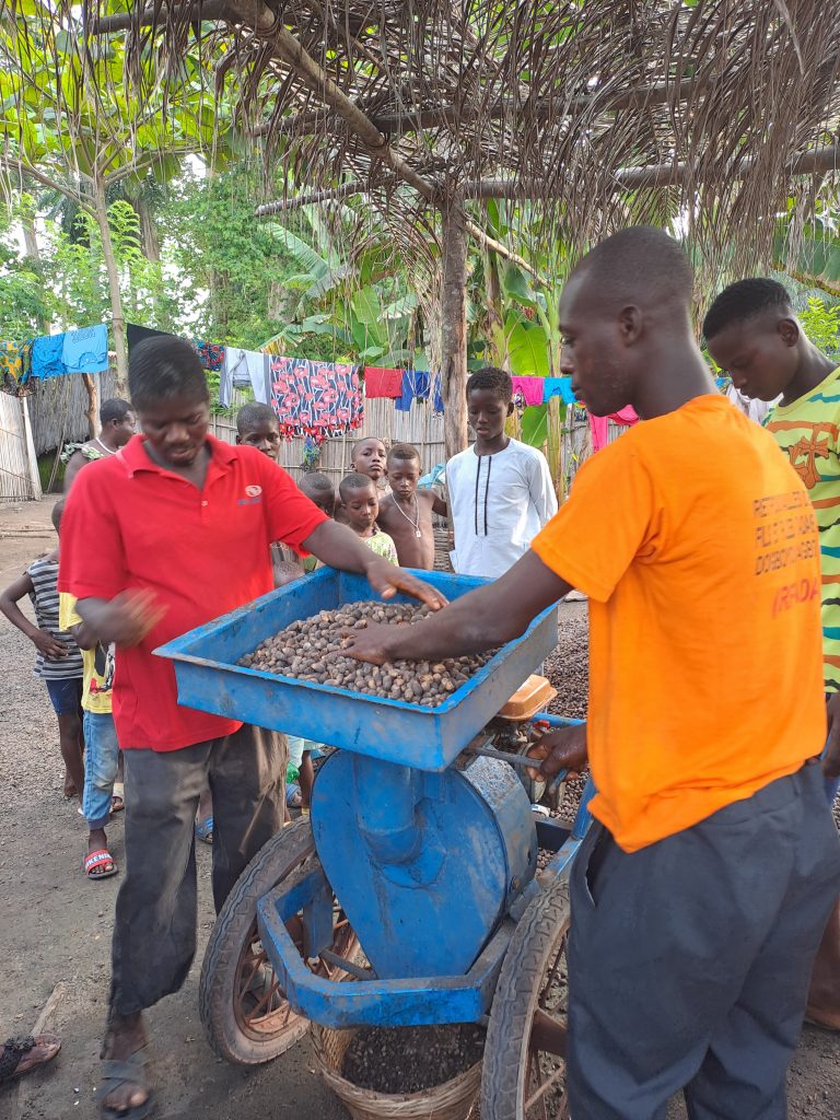 Sie präsentieren uns ihre Maschinen, die sie durch unsere Unterstützung anschaffen konnten.Mit der einen Maschine werden zunächst die Nüsse geöffnet.