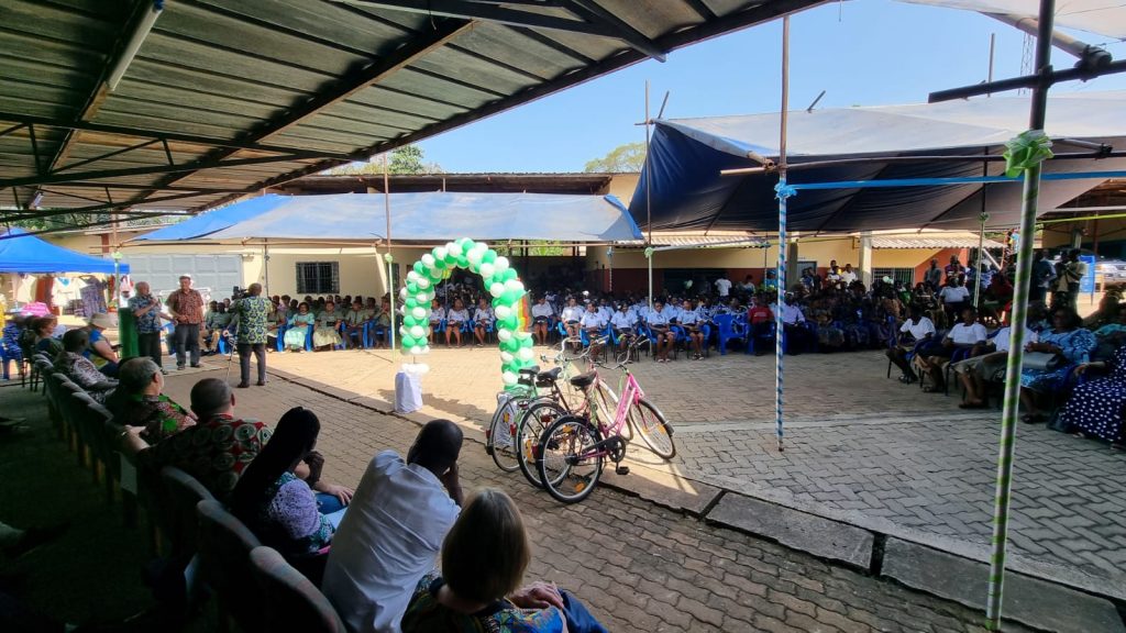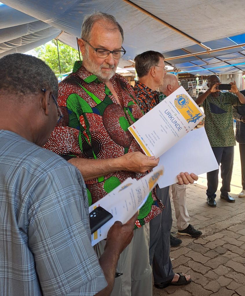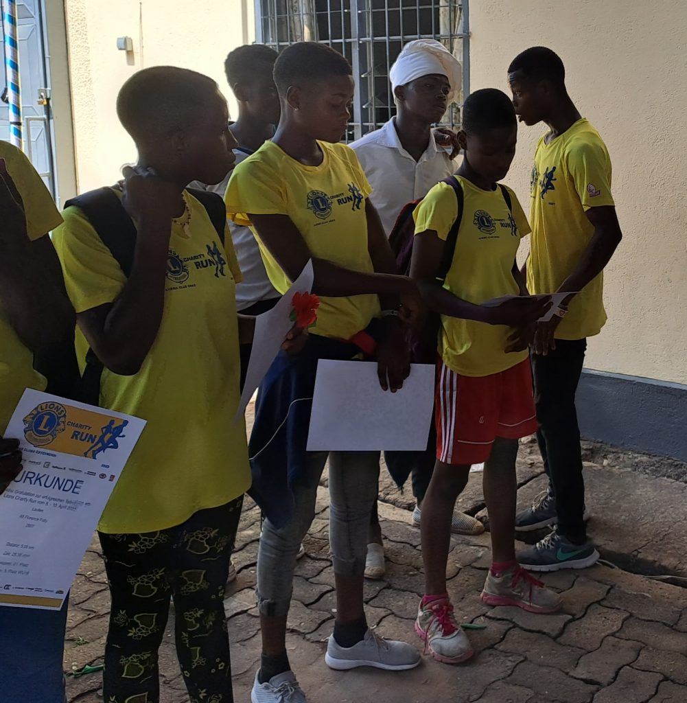 Im Anschluß an die Feier gibt es eine Preisverteilung von 3 Fahrrädern und einer Nähmaschine, die bei einer Tombola im Vorfeld verlost wurden. Leider geht das ganze im allgemeinen Jubel – Trubel etwas unter. Genau wie auch die Verteilung der Urkunden, die Hubert für die Teilnehmer des Lions Cup im Frühjahr mitgebracht hat. Das war im März eine super tolle Veranstaltung, bei der faßt alle Lehrlinge und Mitarbeiter des ABCN, sowie die Mädchenfußballmannschaften mitgelaufen sind .