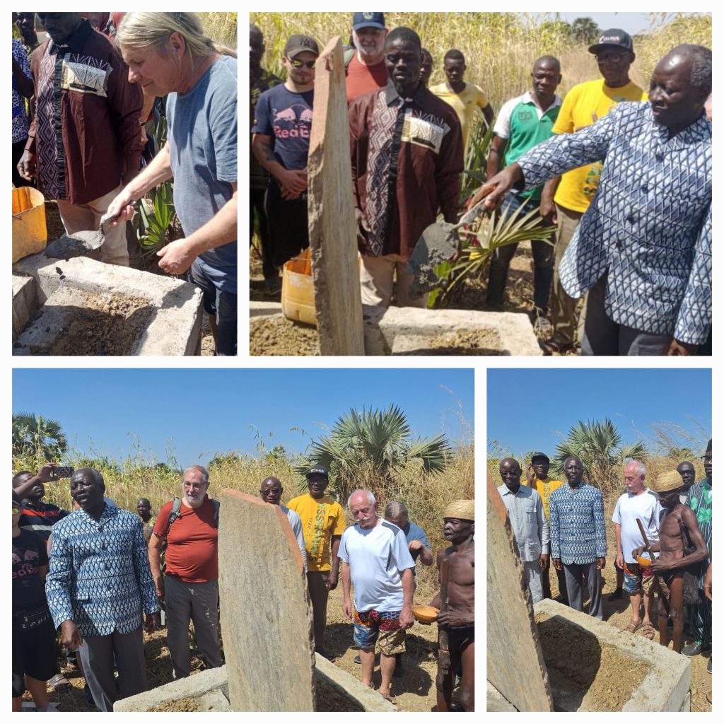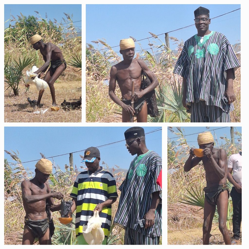 Ein Voodou Priester schlachtet ein Huhn. Das Blut läßt man auf den Boden tropfen als Nahrung für die Götter. Wenn das Huhn beim töten in Richtung aufgehende Sonne schaut und es, wenn der Kopf ab ist noch ordentlich umher pfluddert, so wird das Projekt gut funktionieren – bei uns hat alles geklappt. Auch von dem Hirsebier wird etwas für Die Götter auf den Boden gekippt. Der Präfekt meint dann, der Priester soll mehr selbst trinken, sonst würden die Götter betrunken …. alle lachen.