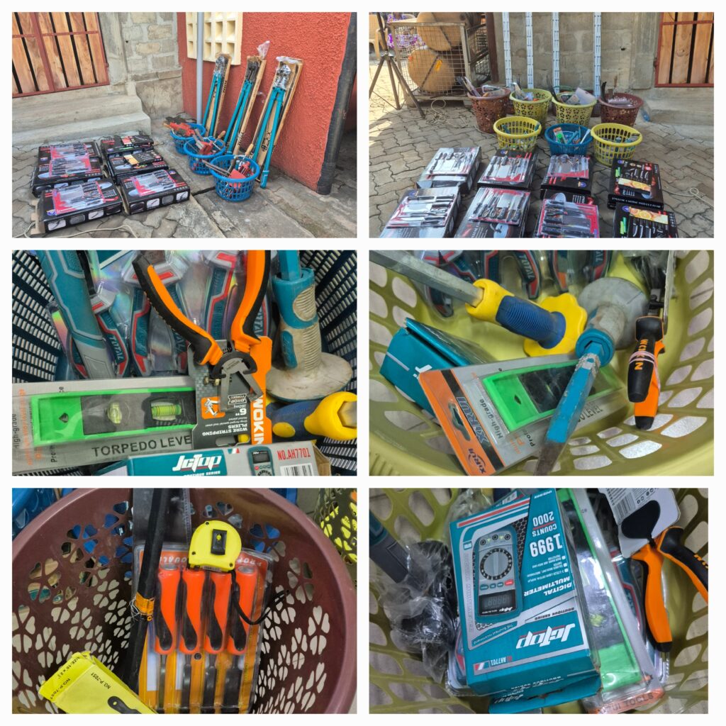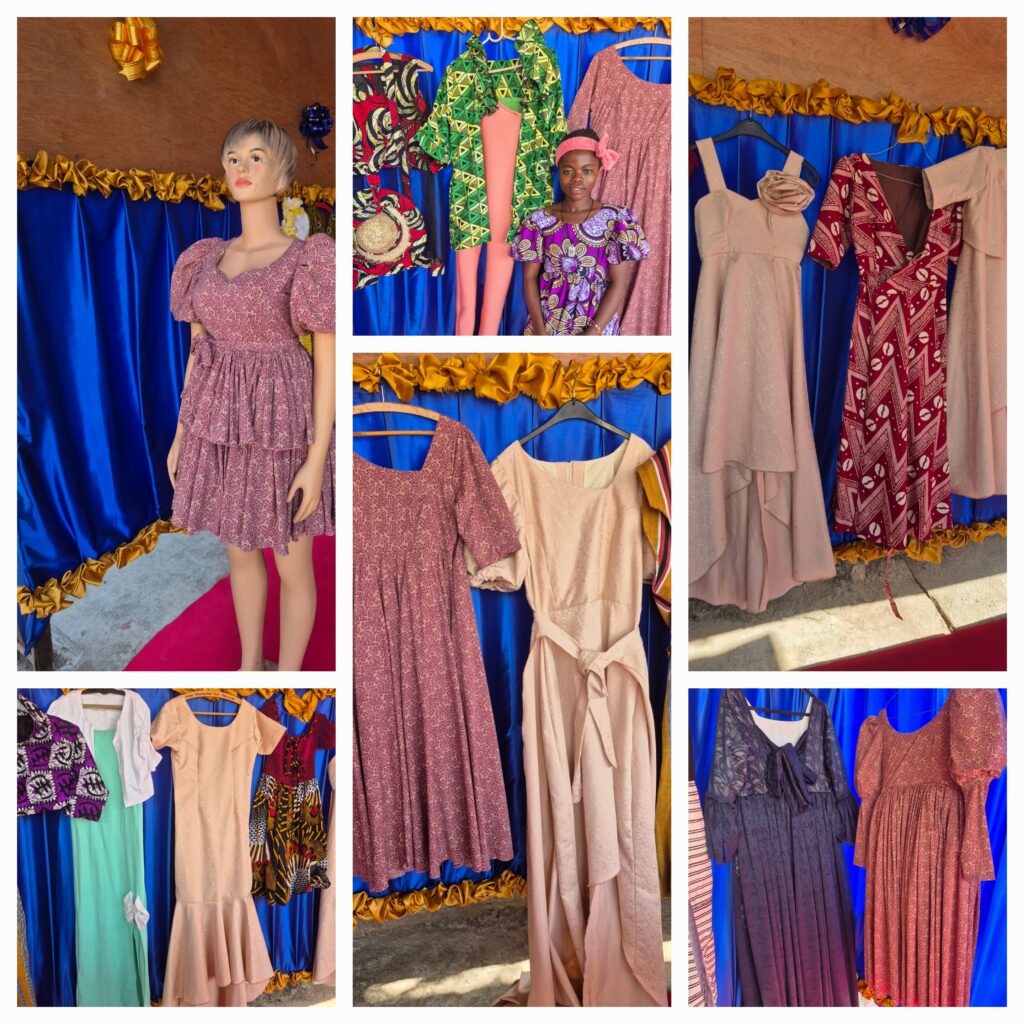 Während der Feier ist vor der Schneiderei eine Ausstellungsfläche mit den neuesten Modellen, die aus den vielen Stoffspenden aus dem Container genäht wurden, aufgebaut… und es konnten sogar Teile verkauft werden bzw. waren Interessentinnen da, die in der kommenden Woche vorbeikommen wollen um sich etwas nähen zu lassen.