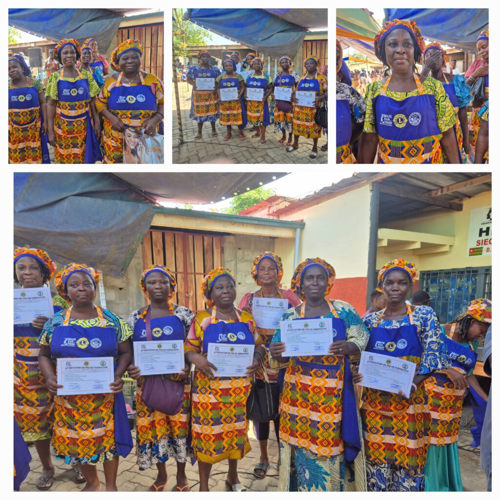 Dieser Lionsclub hat gemeinsam mit den „Lions International“ in direkter Nachbarschaft zum Ausbildungszentrum und den umliegenden Schulen eine Kantine finanziert. Neben den Schülerspeisungen finden dort auch Schulungen für Frauen statt, die an Schulen selbst zubereitetes Essen verkaufen. Bei einem Kurs nach den Sommerferien, haben über 30 Frauen teil genommen und heute bekommen sie dafür ihr Zertifikat überreicht. Leider konnten die Frauen, die weiter entfernt wohnen nicht kommen, da sie ja auch heute kochen und an den Schulen das Essen ausgeben müssen. Ihnen wird aber ihr Zertifikat, sowie eine Schürze und Kopfbedeckung gebracht.