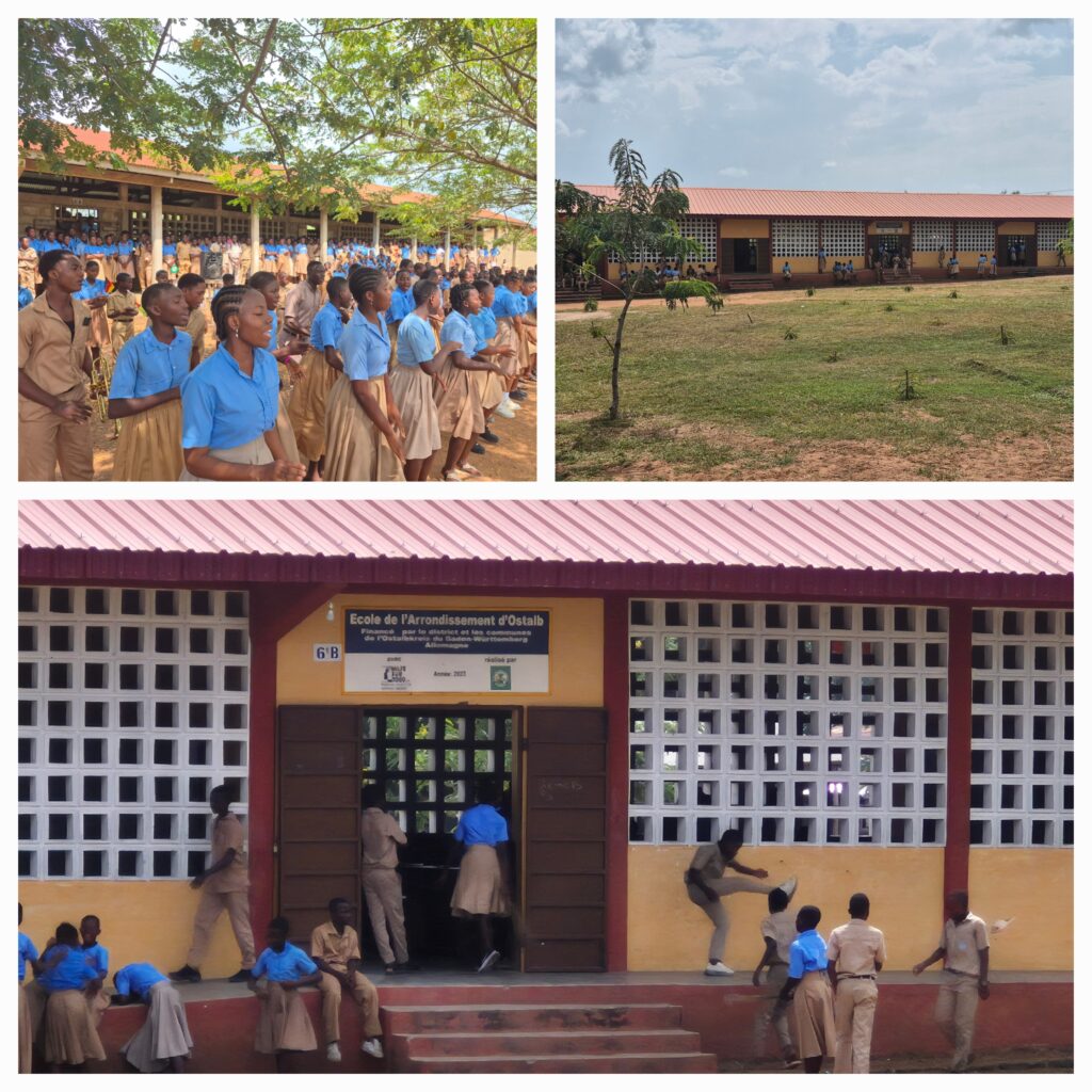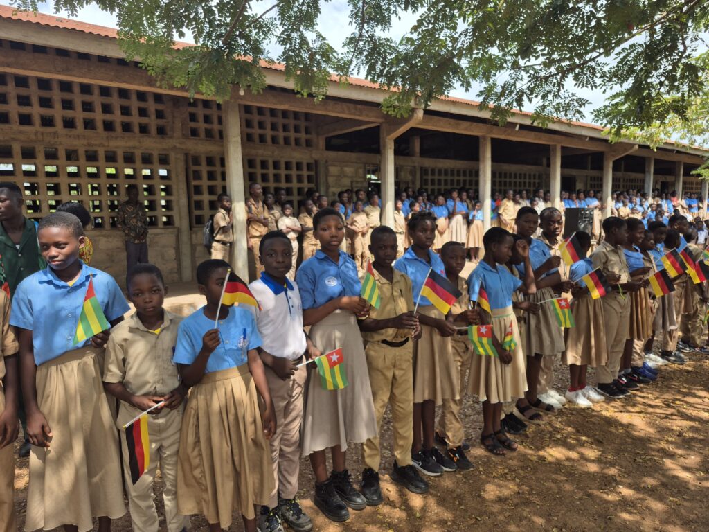 Vom neuen Rektor und den Lehrkräften werden wir begrüßt und auf dem Platz zwischen den Schulgebäuden werden die togoische u.die deutsche Fahne aufgezogen und beide Nationalhymnen gesungen.