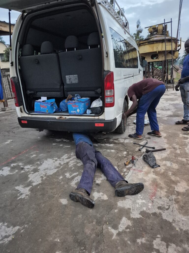 Kurz bevor wir Kpalime erreichen fährt der Fahrer immer langsamer und der Bus gibt seltsame Geräusche von sich …. zum Glück schaffen wir die wenigen km noch und bei der Einfahrt in den Hof vom ABCN gibt der Bus den Geist auf. Zum Glück gibt es im Zentrum auch Automechaniker sie machen sich sofort an die Arbeit.