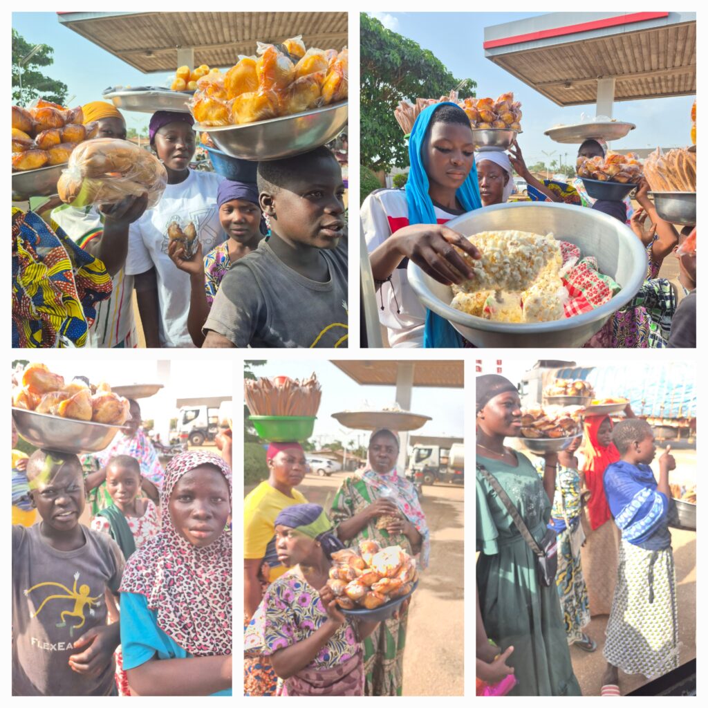 Auf dem Weg müssen wir noch tanken. Der Liter Diesel kostet gerade 697 Fcfa, das ist etwas mehr als 1,- €. An den Tankstellen, aber auch an den Mautstellen und an den roten Ampeln stehen immer Leute, die etwas verkaufen wollen. Auch heute werden wir regelrecht überfallen.