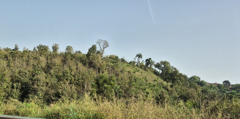 Auf einem freien Stück wurden Yamshügel angelegt. Die Yamswurzeln sind sehr stärkehaltig und werden zu Fufu, Yamsfriten usw. verarbeitet. Daneben ist ein kleines Feld auf dem heute morgen schon Bohnen geerntet wurden.