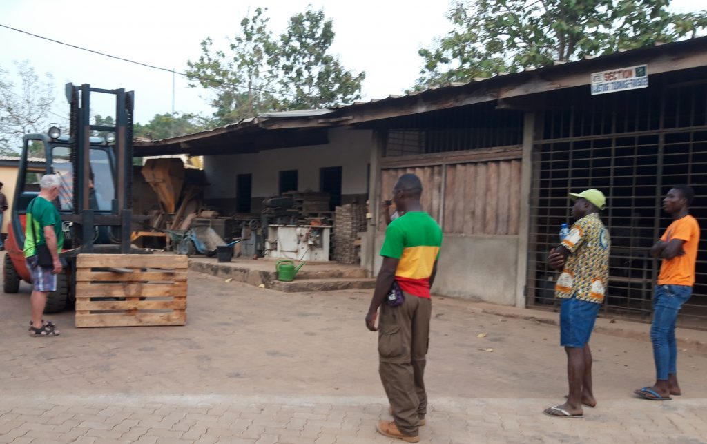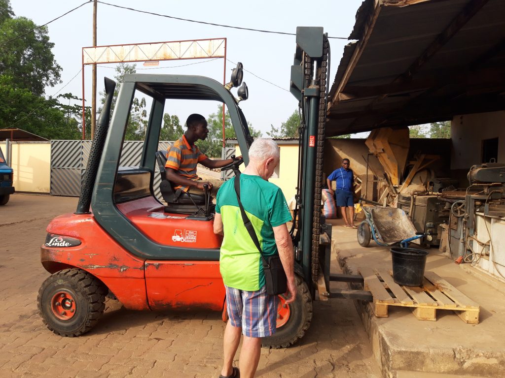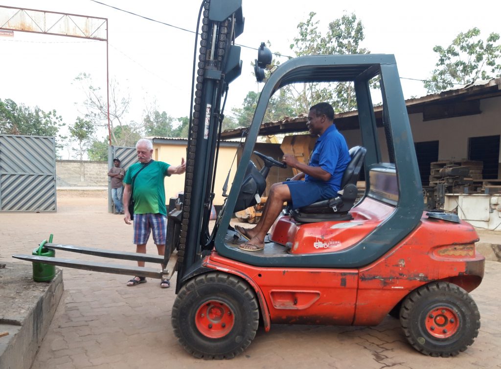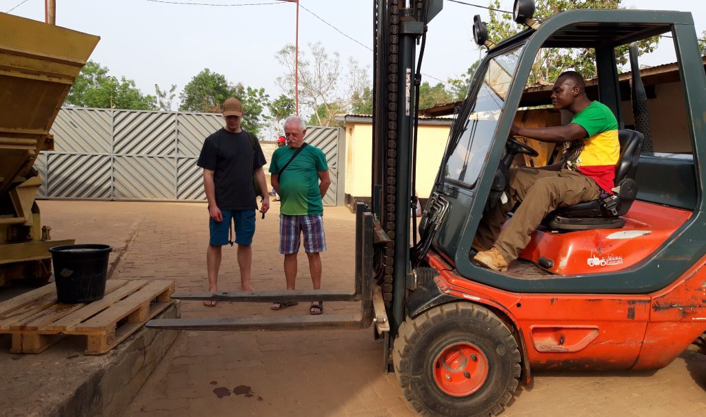 Danach werden wir im ABCN schon erwartet. Done macht mit fünf Mitarbeitern einen Kurs zum Fahren mit dem Gabelstabler. Mit sehr großer Konzentration sind die fünf am Werk.