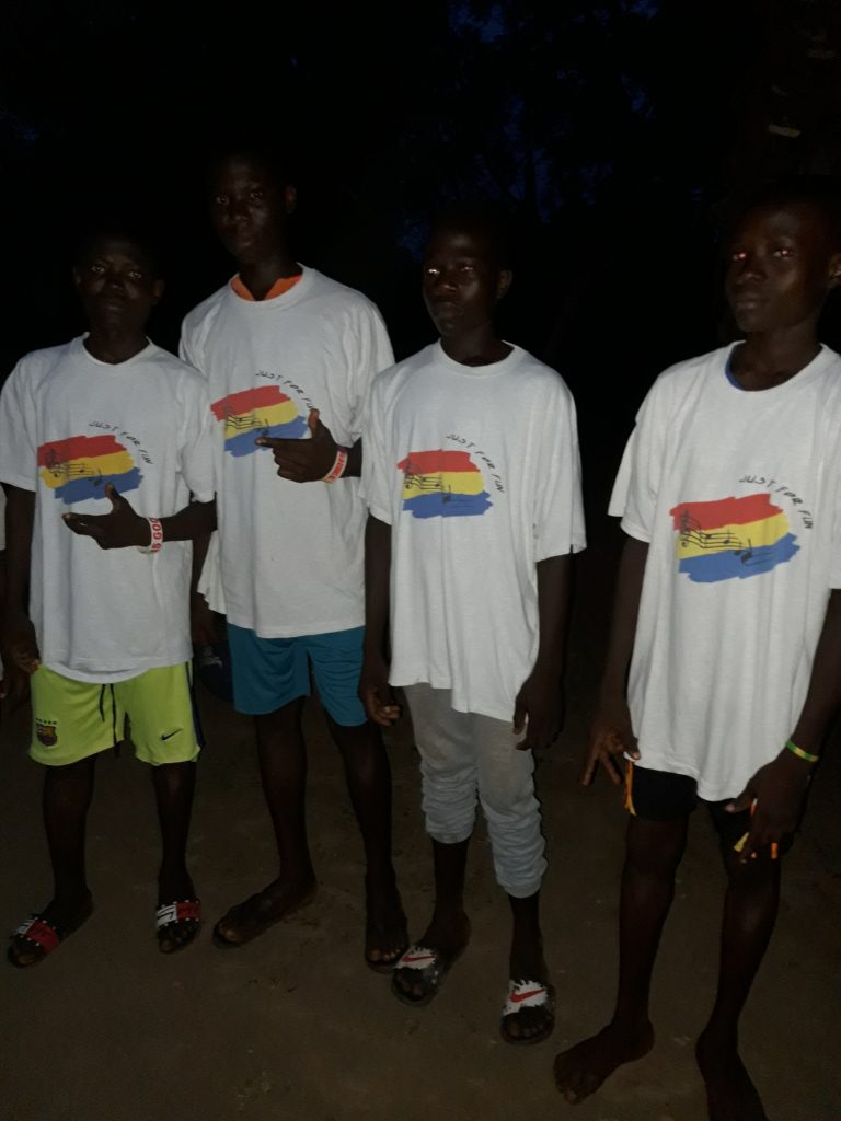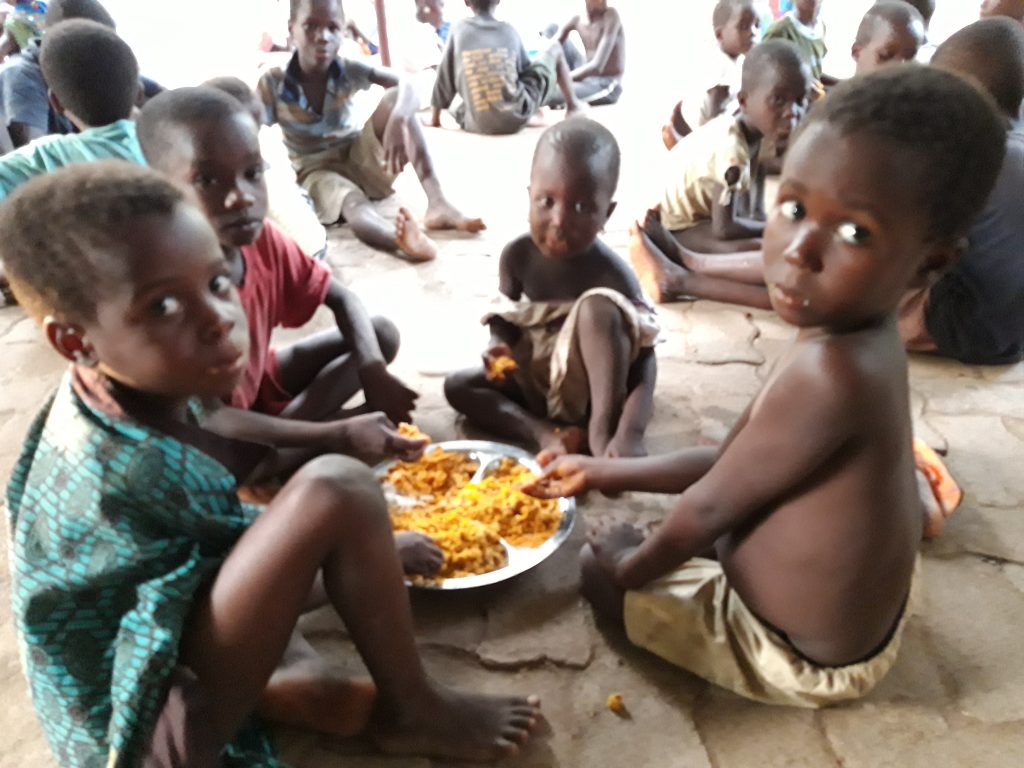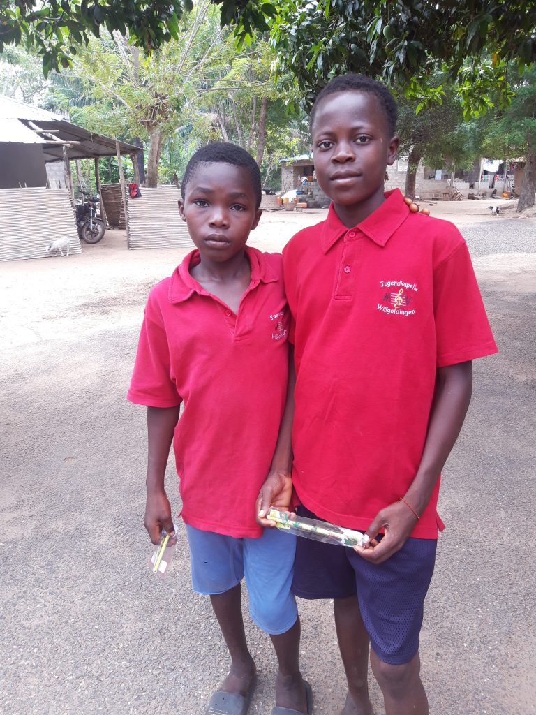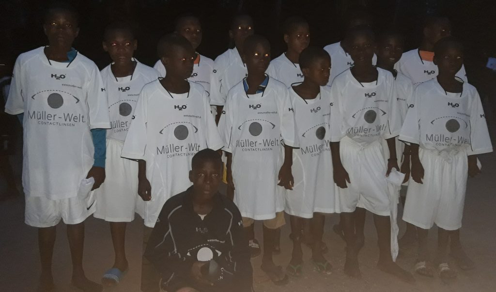Dort erhalten gerade die Kinder des Dorfes ein Essen, das Victorine und Leon an jedem Abend, an dem sie in Agbetiko sind spenden. Die Jungs der Fußballmannschaft erhalten von uns eine Trikotsatz aus dem Container. und die anderen Kinder T-Shirts vom Musikverein aus Wissgoldingen.