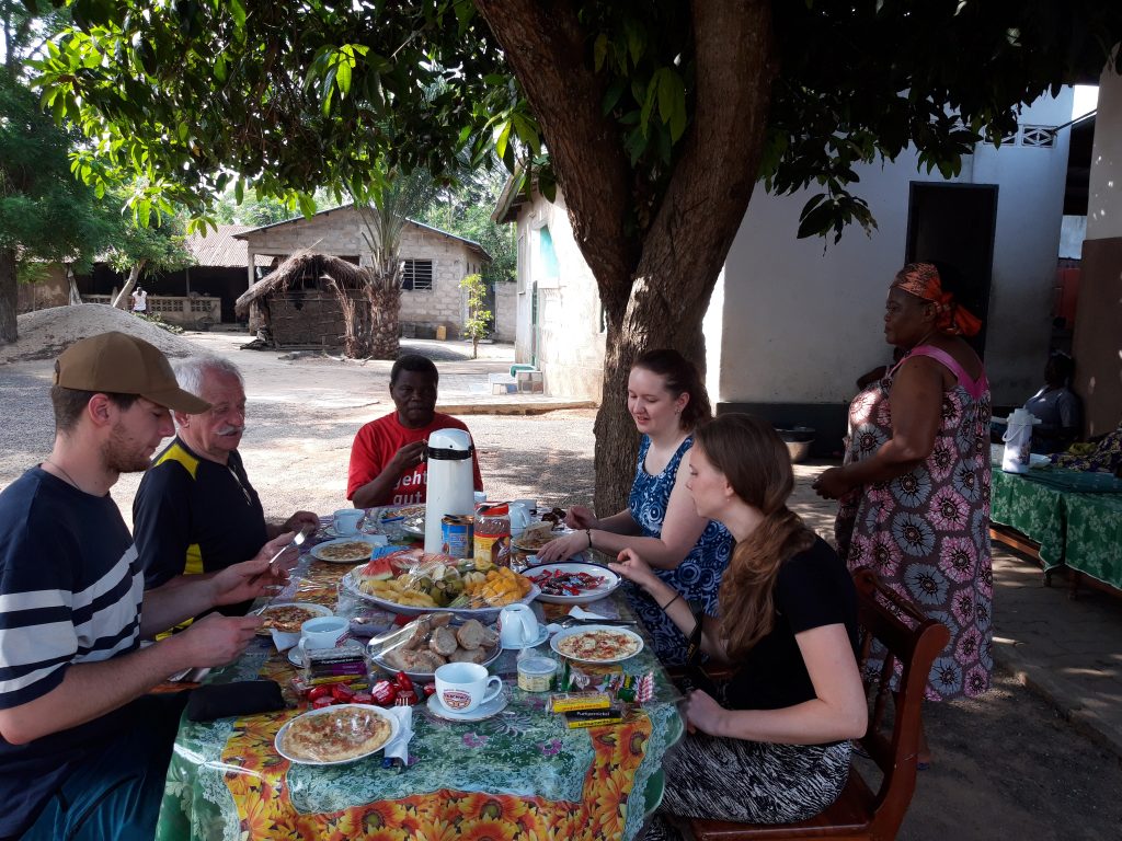 Mittwoch 11.3.2020 – Bis auf die Brett harten Matratzen hatten wir eine angenehme Nacht. Bei den Temperaturen geht doch nichts über eine Klimaanlage. Zunächst fahren wir wieder nach Agbetiko zu Victorin und Leon, wo wir schon zum Frühstück unter dem Mangobaum erwartet werden.