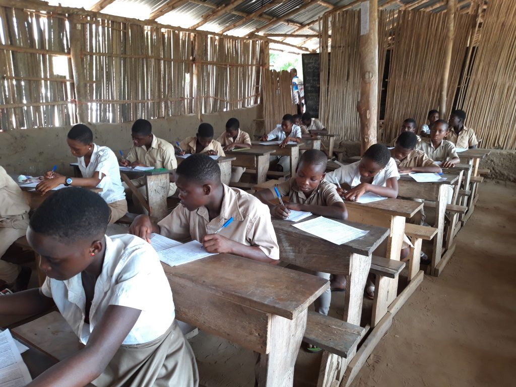 Unser nächster Besuch gilt einem College an der Beningrenze. Bereits vor 1 ½ Jahren haben sie einen Antrag auf den Bau einer Schule gestellt. Die Schule besteht nur aus Apatams. Ein großes Gebäude abgeteilt in 4 Klassenräume und ein Magazin. Das Büro ist ein separates kleines Lehmhaus daneben steht ein kleines Apatam als Besprechungsraum. Es ist mucksmäuschenstill, denn gerade schreiben die Schüler eine Prüfung.