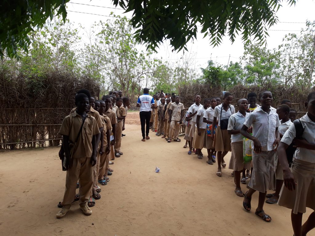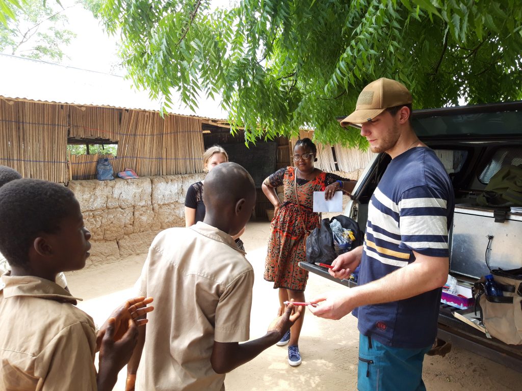 Kai verteilt an die Schüler Kugelschreiber. zu unserer Überraschung gibt es kein Chaos wie sonst bei solchen Aktionen. Im Nu haben sich alle Schüler in 2 lange Reihen aufgestellt und nehmen mit einem strahlenden Mercie die Kulis entgegen.