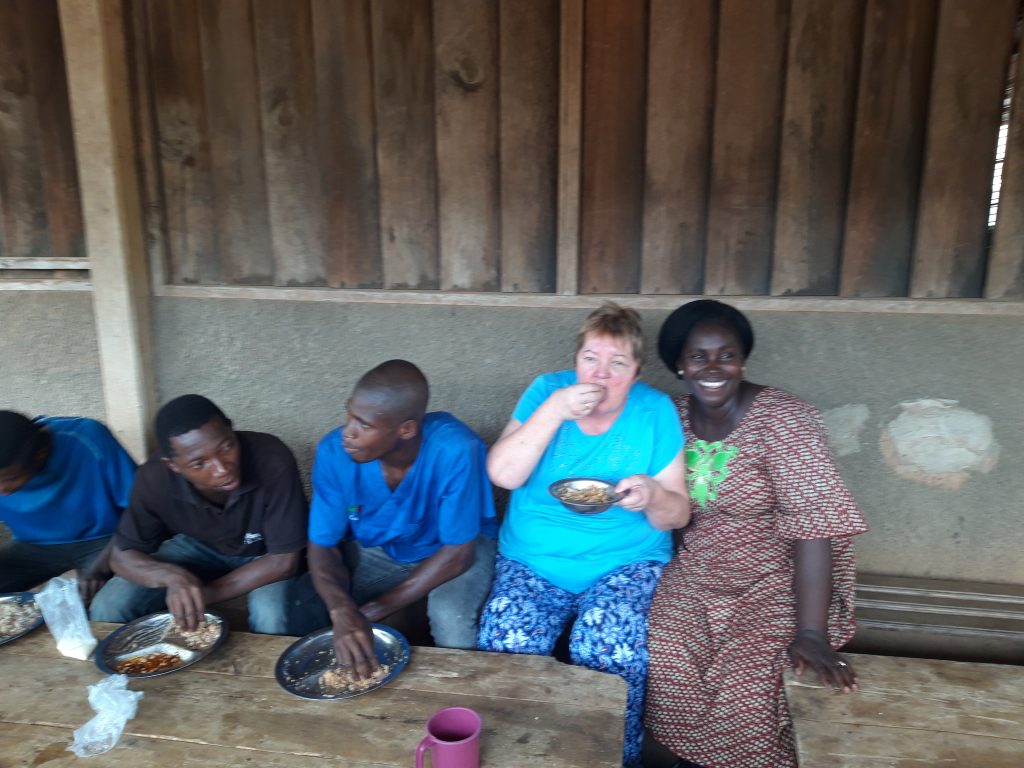 Spontan lädt mich die Köchin zum Essen ein und die Azubis freuen sich riesig, dass ich mich dazu setze und mit esse,da bin ich ja nicht unbedingt begeistert. Aber sofort ist zu spüren wie sich alle freuen, dass ich zusage. Es gibt Bohnen mit einer sehr scharfen und sehr fettigen Soße und da zu einen kleinen Beutel mit Maniokmehl. Das Mehl streut man darüber und es saugt die ölige Soße auf und dann isst man mit den Händen. Es schmeckt sehr gut… ja und es macht Spaß mit den Lehrlingen zusammen zu essen…und alle freuen sich das Mama Togo beim Mittagessen dabei ist….ich finde es auch sehr schön… .