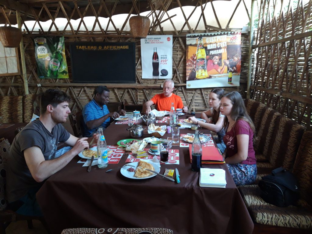 Eine Stunde später haben wir uns mit Felix Magnangou wieder im Marox verabredet. Wir besprechen nochmal die besuchten Projekte. Aus dem Dorf, dass wir nicht besucht haben, kommt die Anfrage für einen Kindergartenbau. Felix wird die Daten erheben und uns einen Antrag zuschicken. Beim gemeinsamen Essen ,wir haben auch die Frau von Felix eingeladen, diskutieren wir vor allem über Bildung und Ausbildung. Die Frau von Felix ist Rektorin an einer Grundschule. Wir fragen sie, warum es so wenige Lehrerinnen gibt. Felix antwortet, weil sie so wenig verdienen und der Job so anstrengend ist. Mehrmals versuchen wir die sehr zurückhaltenden Frau ins Gespräch einzubinden – leider nur mit mäßigem Erfolg. Zwei Tage später erzählt uns Amelie, dass Mädchen, vor allem in den sehr ländlich geprägten Gegenden, sehr oft zu Hause für die Feldarbeit gebraucht werden und das es noch Überzeugungsarbeit braucht um dies zu ändern. Sie meint – wir dürfen nicht aufgeben.