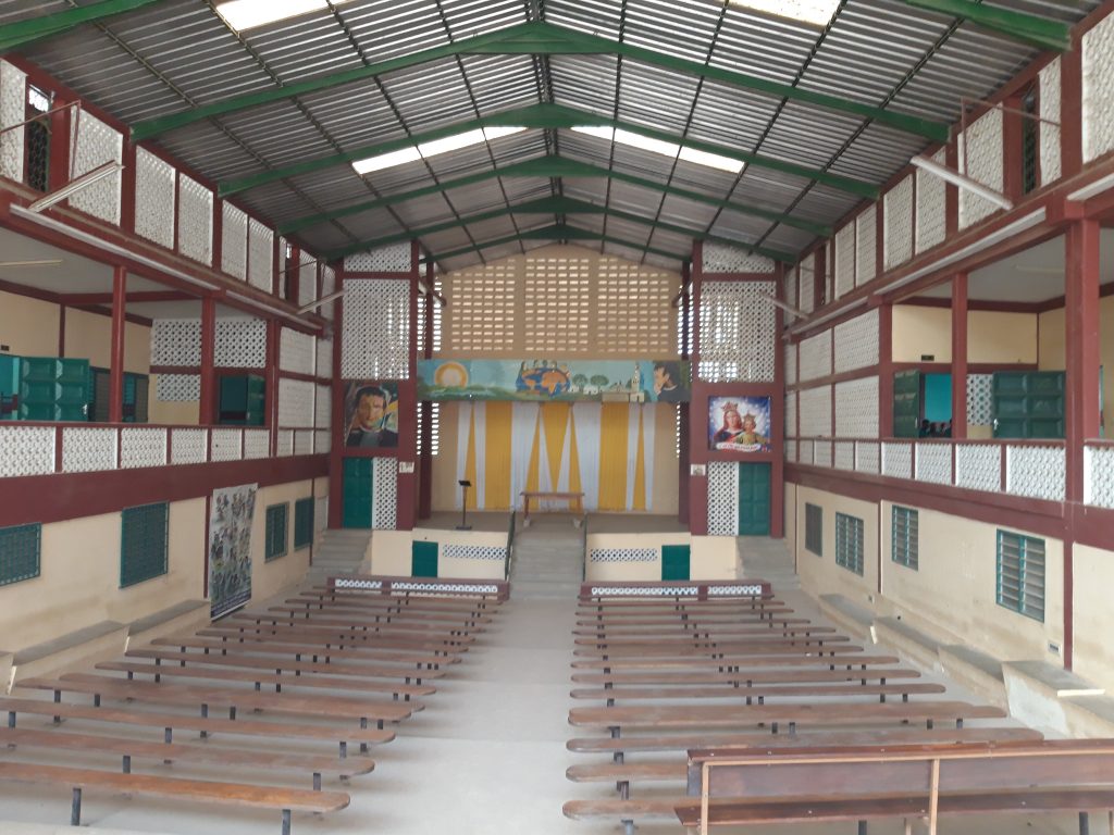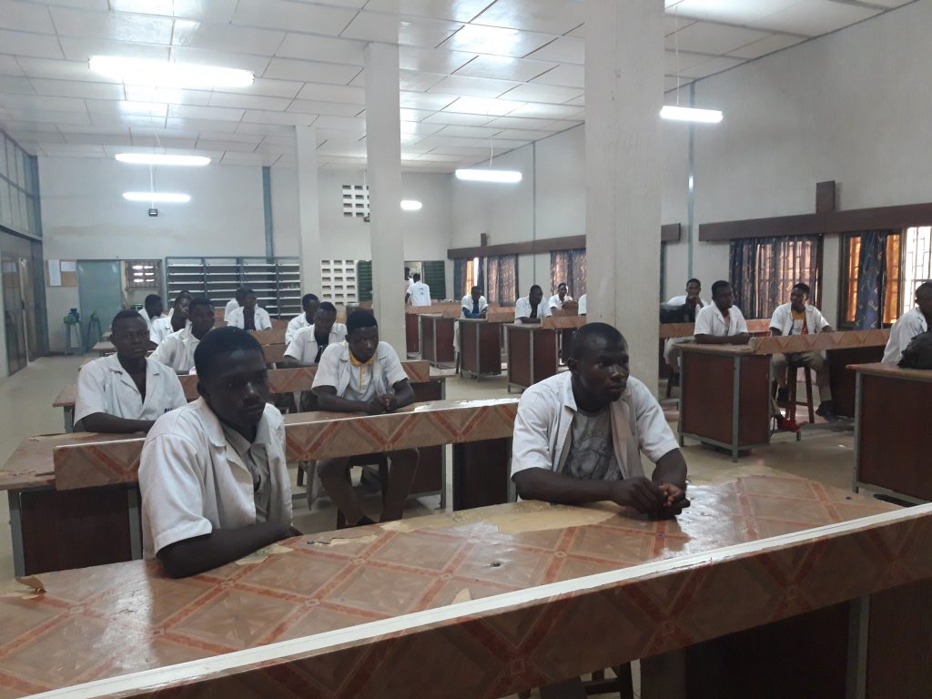 30 Schüler haben die Möglichkeit im Internat unterzukommen. Die Ausbildung dauert 3 – 4 Jahre und kostet jährlich zwischen 45000,- bis 120 000,- Fcfa , je nach Beruf und Ausbildung. Es gibt ein A und B Diplom – ( zu vergl.mit Fachhochschulreife). Das Internat kostet jährlich 120 000,-Fcfa inkl. Verpflegung. Es werden Schüler aller Religionen aufgenommen. Auch Mädchen. Es kommen aber nur vereinzelt welche, da die typischen Männerberufe von den Mädchen kaum angenommen werden und sehr oft die Eltern auch gar nicht wollen, das die Mädchen überhaupt eine Ausbildung machen. Sie werden zu Hause zum arbeiten gebraucht. Das Zentrum macht einen guten Eindruck, allerdings haben nur wenige der Azubis die Möglichkeit, während ihrer Ausbildung direkt in der Praxis zu arbeiten. Die Maurer z.B.erstellen eine Mauer und brechen sie am nächsten Tag wieder ab.