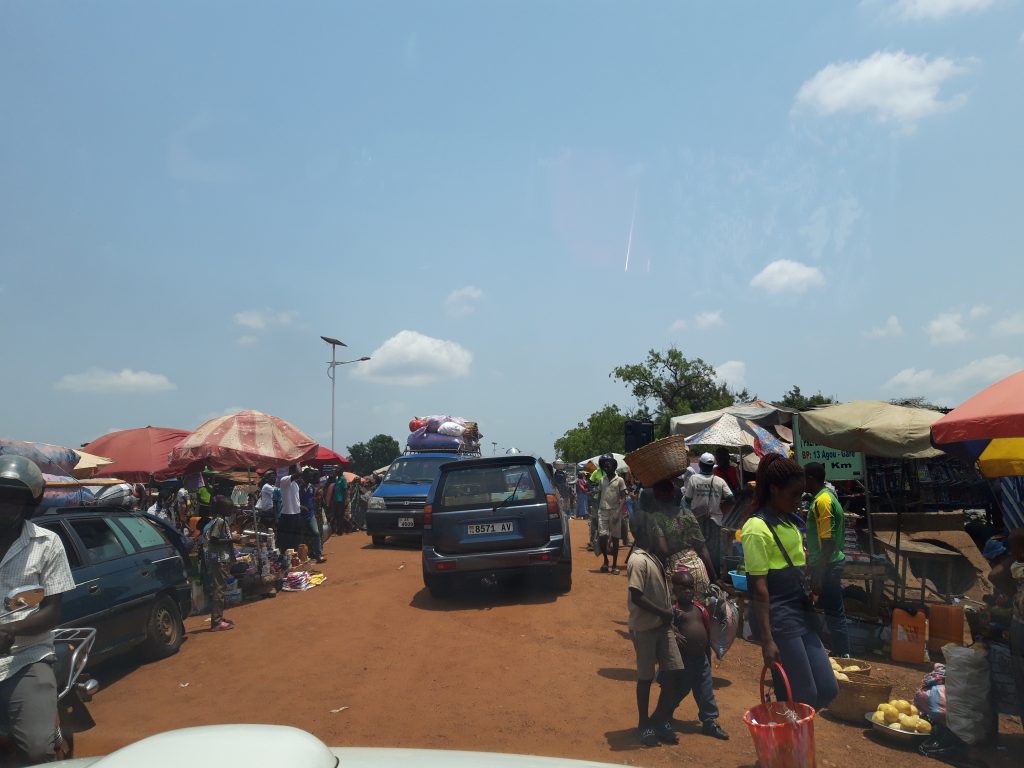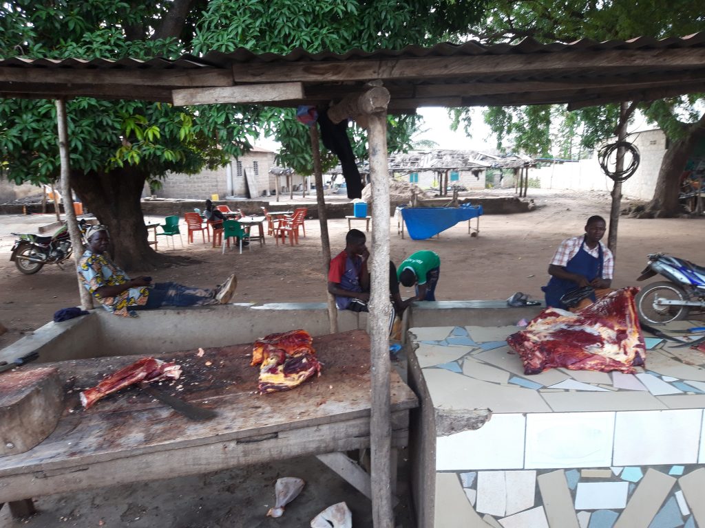 Jeder hat auch die Verantwortung für seinen Baum und durch eine besondere Konstruktion mit Wasserflaschen werden die Pflanzen während der Trockenzeit ständig bewässert und sind bis zum Beginn der Regenzeit angewachsen. Wir sind wirklich beeindruckt und verabschieden uns mit dem Versprechen, den Antrag zu Hause zu beraten.Auf Grund der Hitze sind wir alle ziemlich fertig und suchen uns zunächst eine Kneipe, in der es etwas kühles zu trinken gibt. Die Möglichkeiten sind begrenzt und neben einer afrikanischen Metzgerei werden wir fündig – relativ schnell ( es stinkt erbärmlich) schütten wir die erfrischenden Getränke hinunter und es geht weiter.