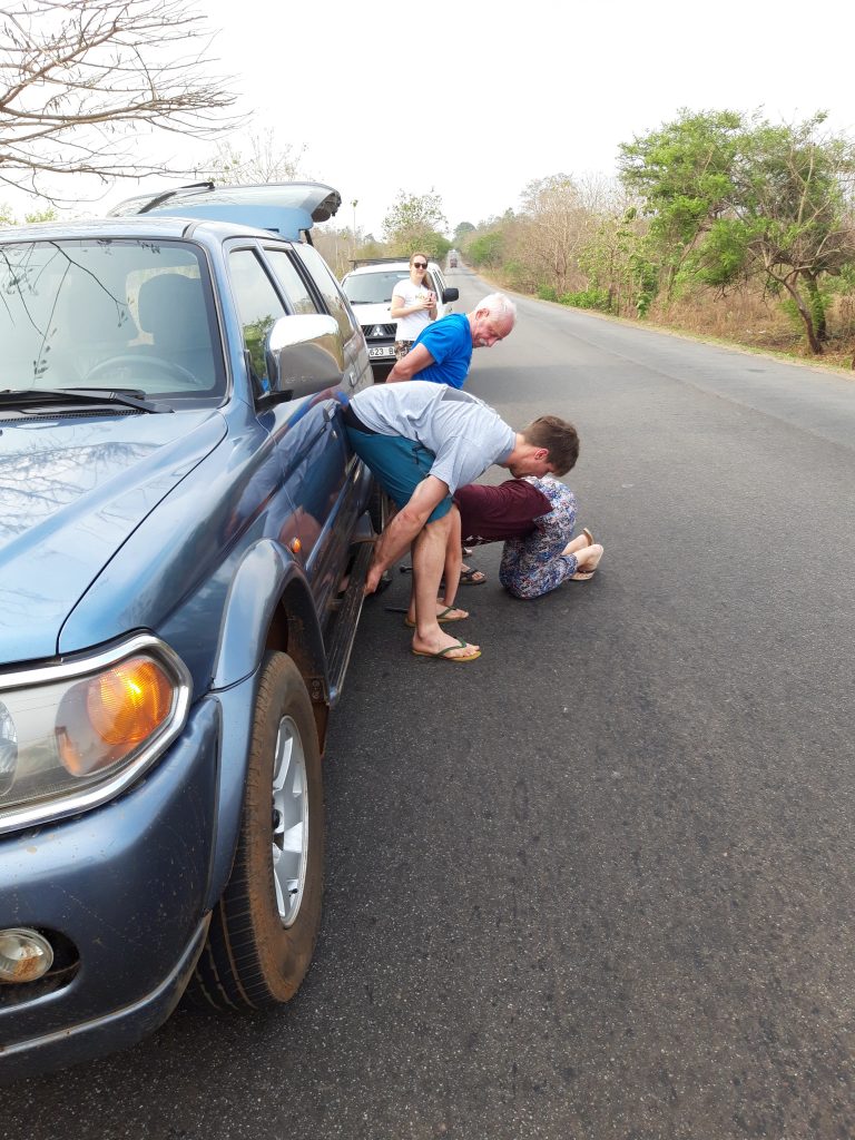 Jetzt fahren wir auf der Rue de National Nr:1 und es ist relativ viel los. Überdimensionale LKW’s und voll beladene Kleinbusse oder PKW’s. Dann haben wir am Auto von Leon einen Platten.