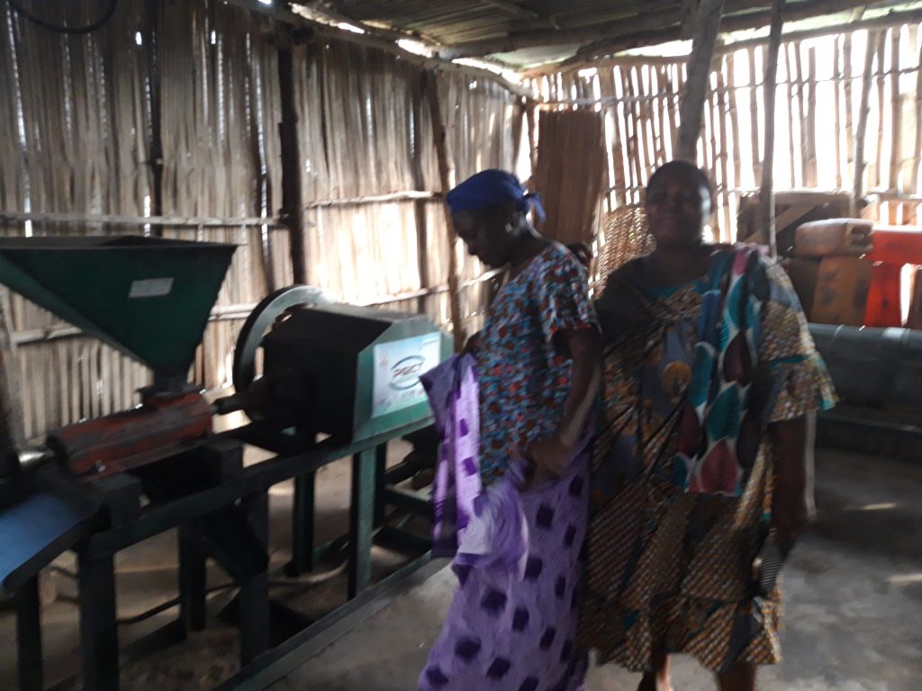 Die Frauen aus Agbetiko bringen ihre Kerne nach Lome und hätten auch gerne eine solche Maschine. Sie führen uns vor, wie die Maschine funktioniert.