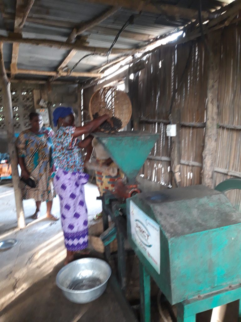 Freitag 13.3.2020 – die 2 Wochen Togo gehen zu Ende, gefühlt waren wir 4 Wochen in Togo und haben einiges erlebt. Schon um 7.00 Uhr haben wir in Aveve eine Termin bei einer Frauengruppe, die eine Maschine besitzt, mit der man aus den inneren Palmkernen kaltgepresstes Palmöl produzieren kann.