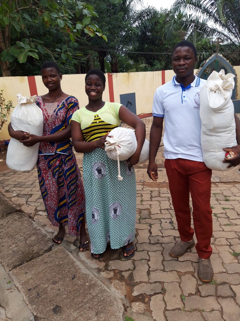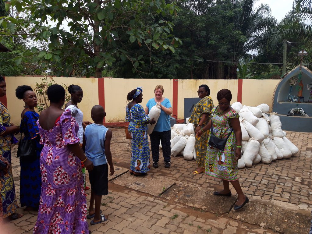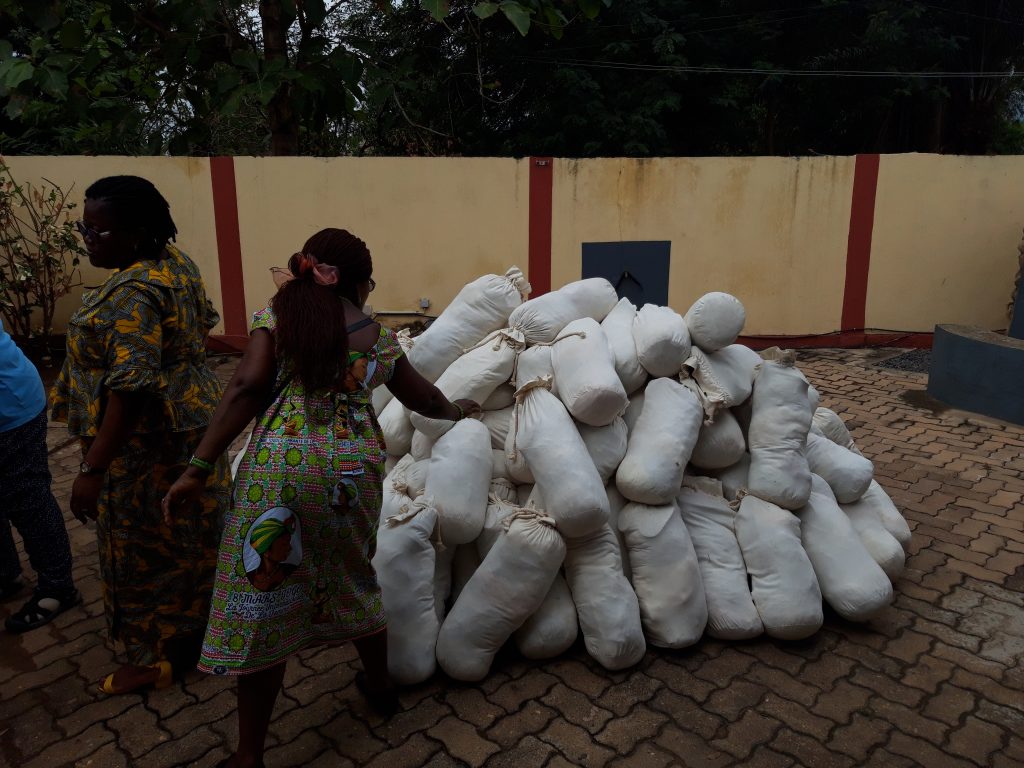 Sonntag 8.3.2020 – Auch die letzte Nacht war wieder gnadenlos heiß, selbst der starke Regen hat keine Abkühlung gebracht und so hieß es wieder ordentlich schwitzen. Nach dem Frühstück bekommen wir um 9.30 Uhr Besuch von vielen Frauen und Kindern. Victorine hat viele Stoffsäcke mit Kleidung, Handtüchern und Bettwäsche befüllt, die wir jetzt an besonders Bedürftige verteilen.