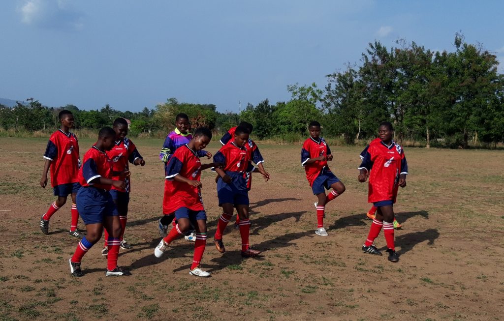 Für 16.30 Uhr ist das Fußballspiel zwischen zwei Mädchenmannschaften aus Kpalime angesetzt. Beide Mannschaften setzen sich aus einer Auswahl von den besten Fußballspielerinen der jeweiligen Schulen zusammen. Die Mädchen sind zwischen 14 und 17 Jahre alt. Für uns werden extra Stühle zum Sportplatz gefahren.