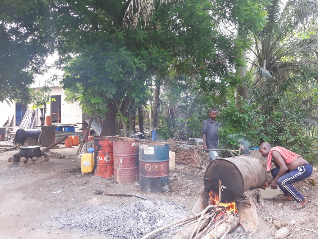 Nach der Ernte werden die Palmkerne zunächst in einem großen Kessel, der auf offenem Feuer steht gekocht und dann durch eine dieselbetriebene Maschine getrieben.