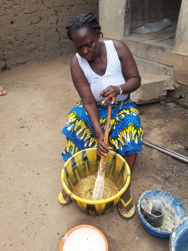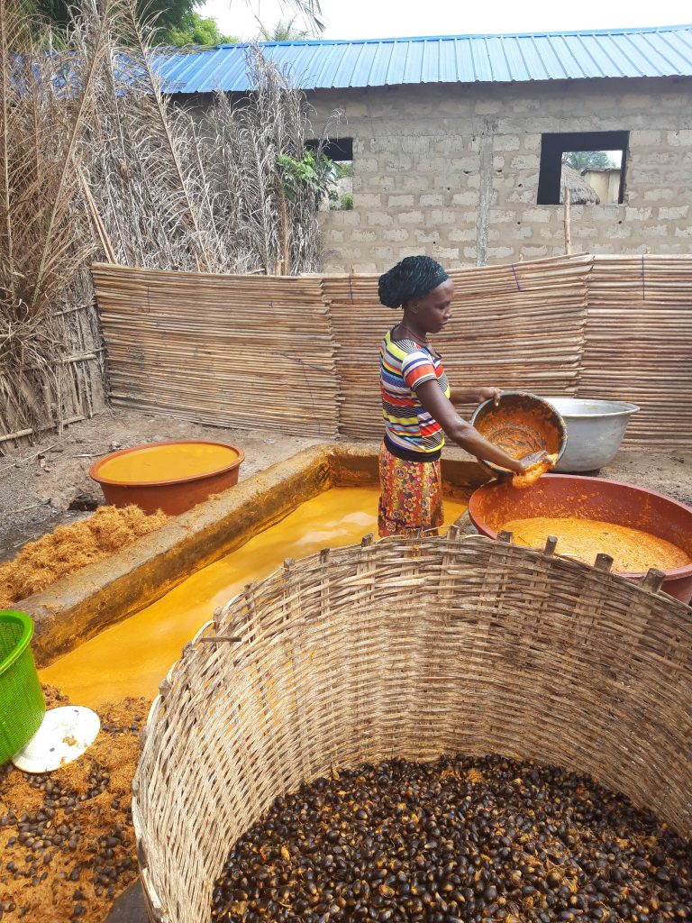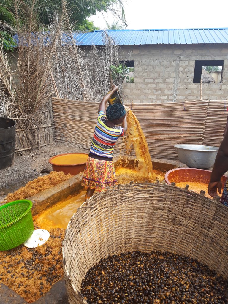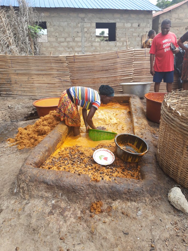 Auf dem Gelände und in den Klassenräumen ist es relativ sauber.Anschließend besuchen wir die Frauen, die Palmöl produzieren.