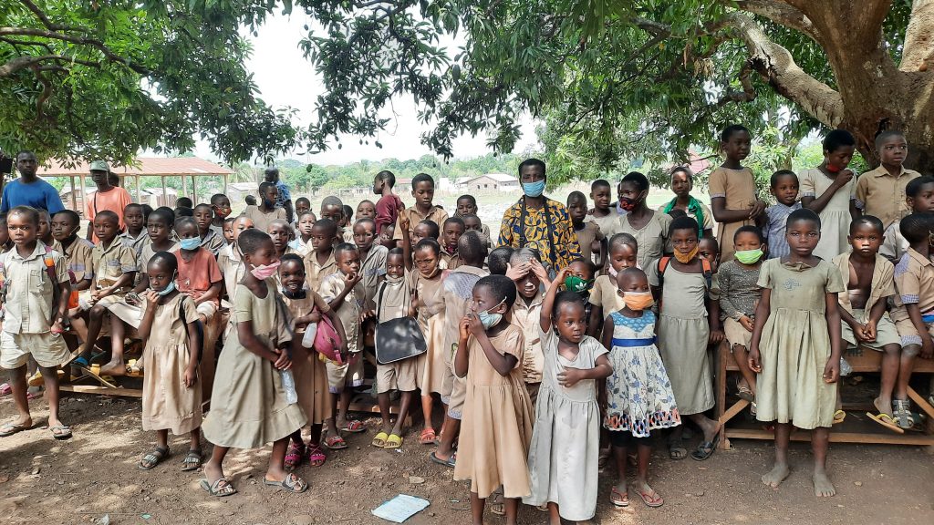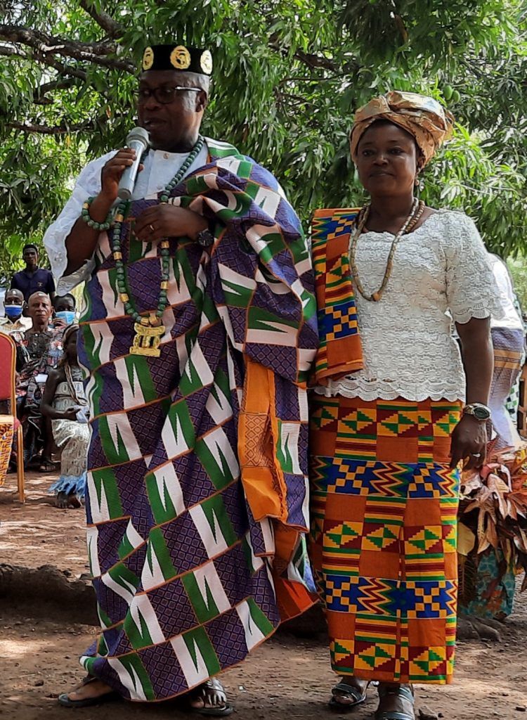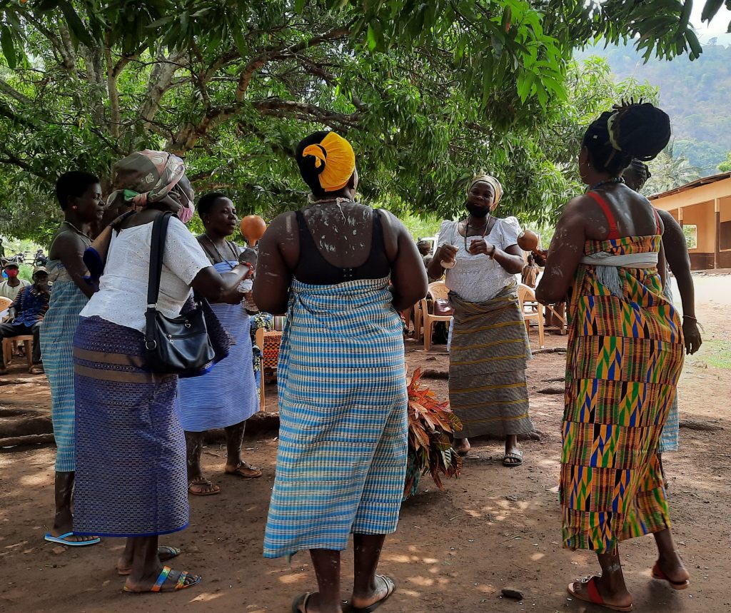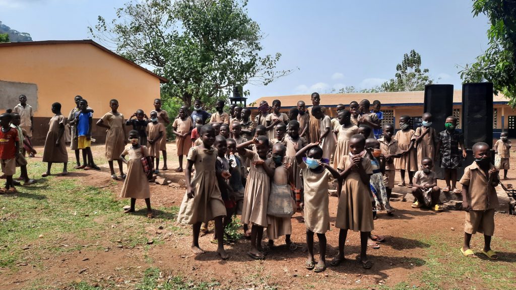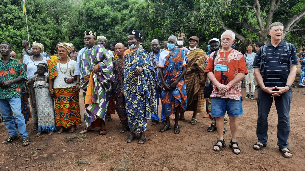 Gleich nach dem Frühstück fahren wir zur Präfektur um den Prefäkten abzuholen. Er ist ein vielbeschäftigter Mann und so müssen wir noch eine Weile warten. Dann geht alles exakt nach Protokoll. Der Präfekt ist zuständig für die Region Kloto, sein Sitz ist in Kpalime. Die Schule liegt in der Präfektur Agou, wir fahren also sozusagen in den Nachbar Landkreis. An der Kreisgrenze werden wir vom dortigen Präfekten empfangen und begrüßt und fahren dann im Konvoi hinter ihm her … mit ausgerollter Standarte und Militärbegleitung. An der Schule werden wir vom traditionellen Dorfchef, der Schulverwaltung, Lehrern, Elternvertretern, vielen Kindern und wahrscheinlich der ganzen Dorfbevölkerung empfangen. In einer traditionellen Zeremonie findet eine Ehrung der Ahnen statt, bei der ein alter Mann für die Ahnen Sodabie und Palmwein opfert, dann spielt eine Musikkapelle und wir werden von der Straße zum Platz des geplanten Schulbaus begleitet.