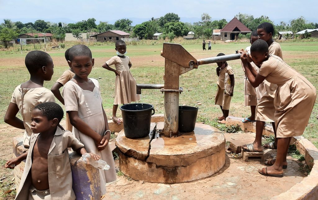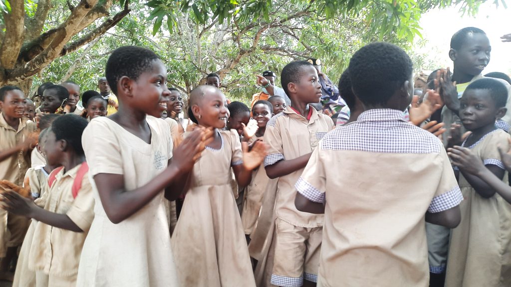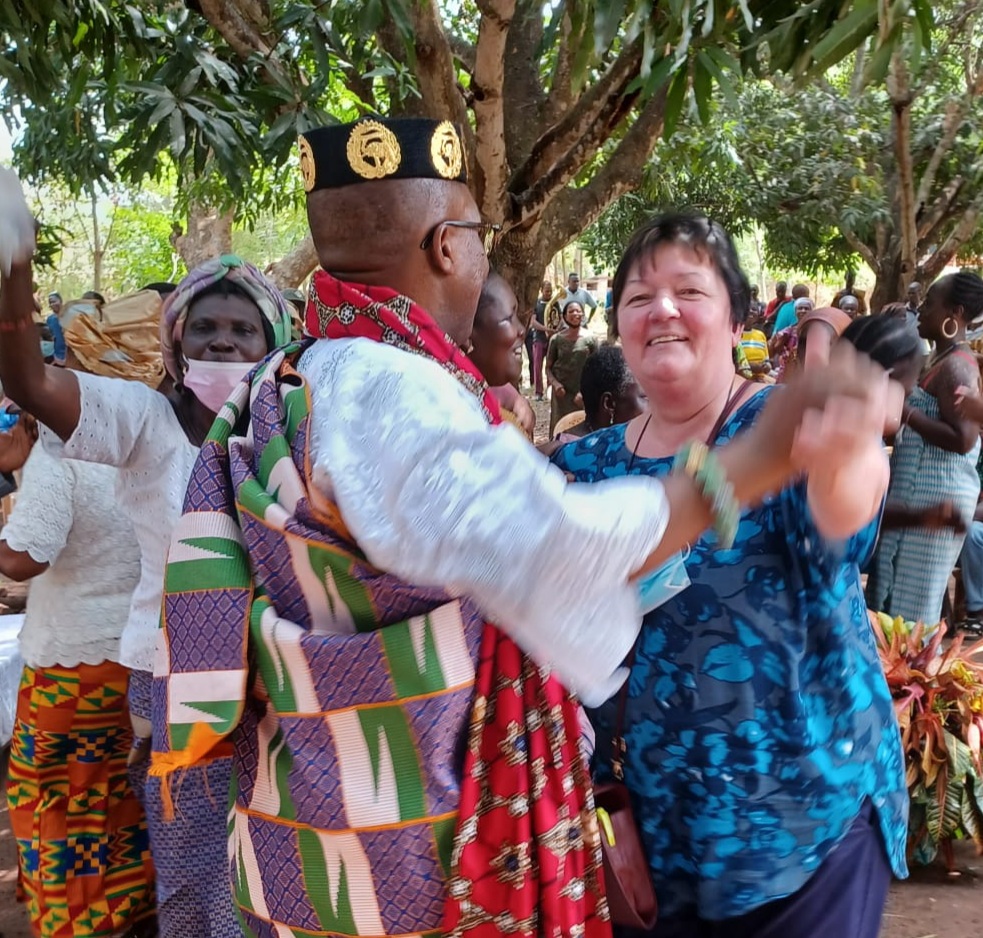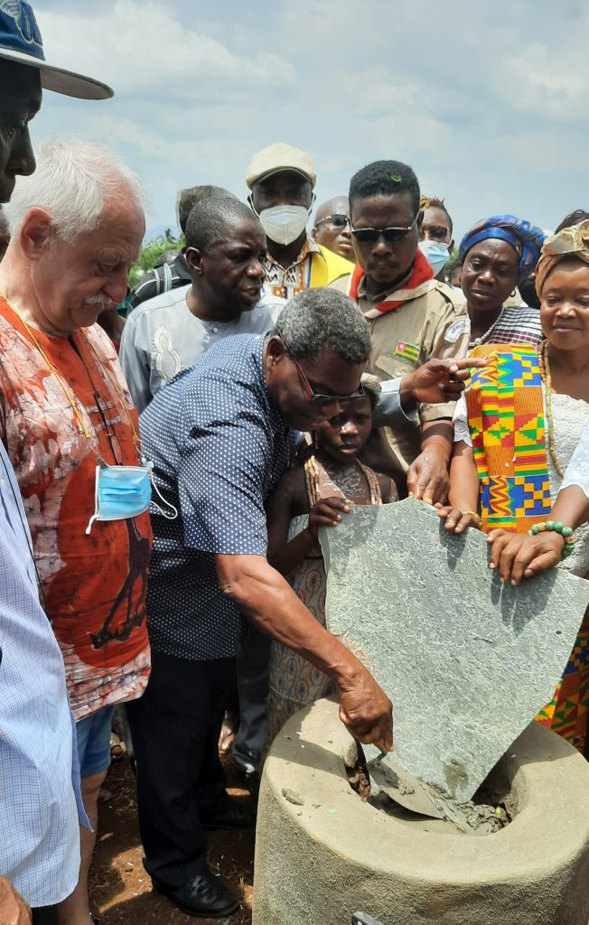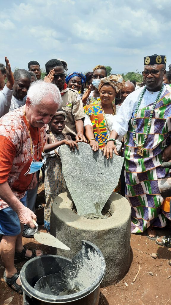 Der traditionelle Dorfchef erzählt dass er heute morgen einen sehr hohen Blutdruck hatte. Es gäbe aber kein Medikament gegen diese Krankheit … wir hätten ihn geheilt, weil wir heute da sind und den Grundstein für dieses neue Projekt legen. Er und die ganze Dorfbevölkerung sind sehr dankbar, dass wir den Weg hierher in dieses Dorf gefunden haben, wo die Kinder bei sehr schlechten Verhältnissen unterrichtet werden und auch die Wasserversorgung ziemlich marode ist .