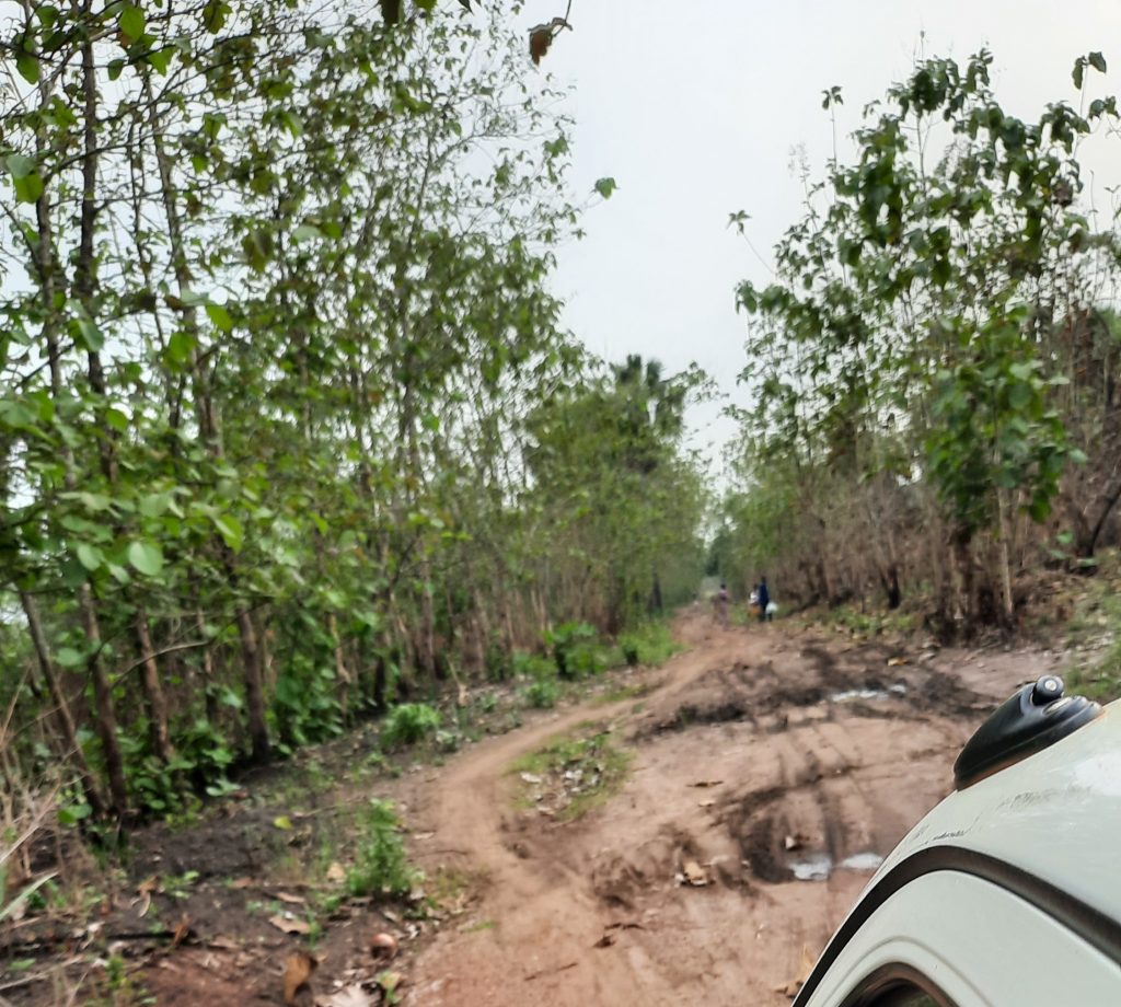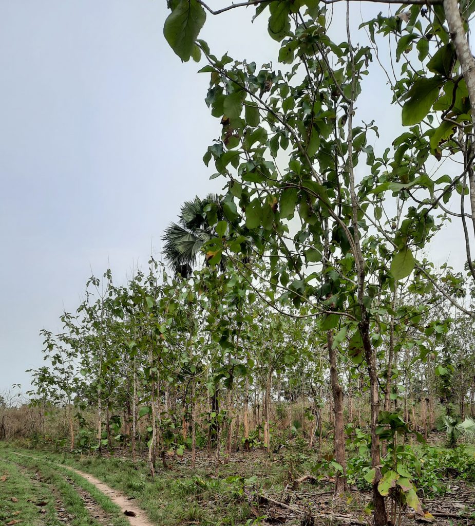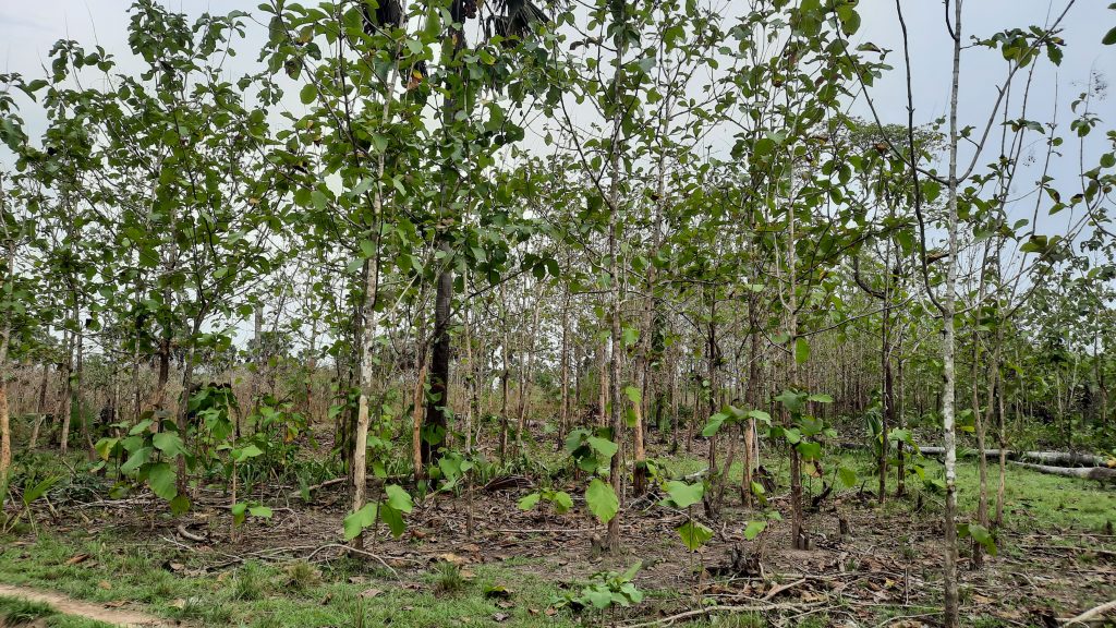 Vor 7 Jahren hat Leon begonnen die 4 ha große Fläche mit Teakholz zu bepflanzen. Es war brachliegendes Land mit viel Gestrüpp, das zunächst mal entfernt werden musste. Inzwischen ist etwa die Hälfte der Fläche bepflanzt und zum Teil sind die Bäume schon ganz schön groß. Die Bewirtschaftung erfolgt durch Männer aus den umliegenden Siedlungen. Dadurch können sie in der wirklich abgelegenen Gegend einer bezahlten Beschäftigung nachgehen.
