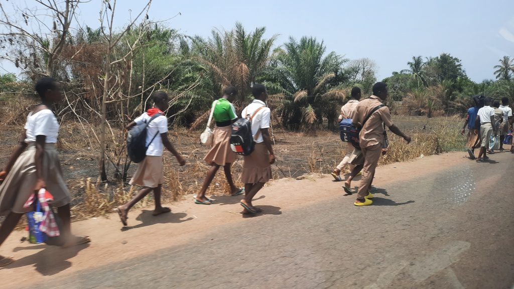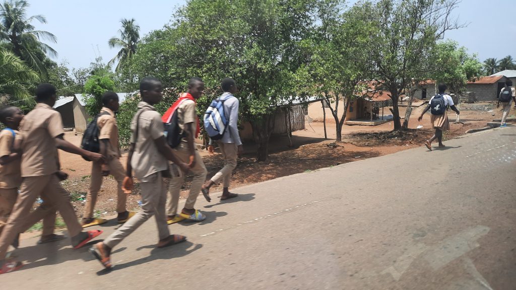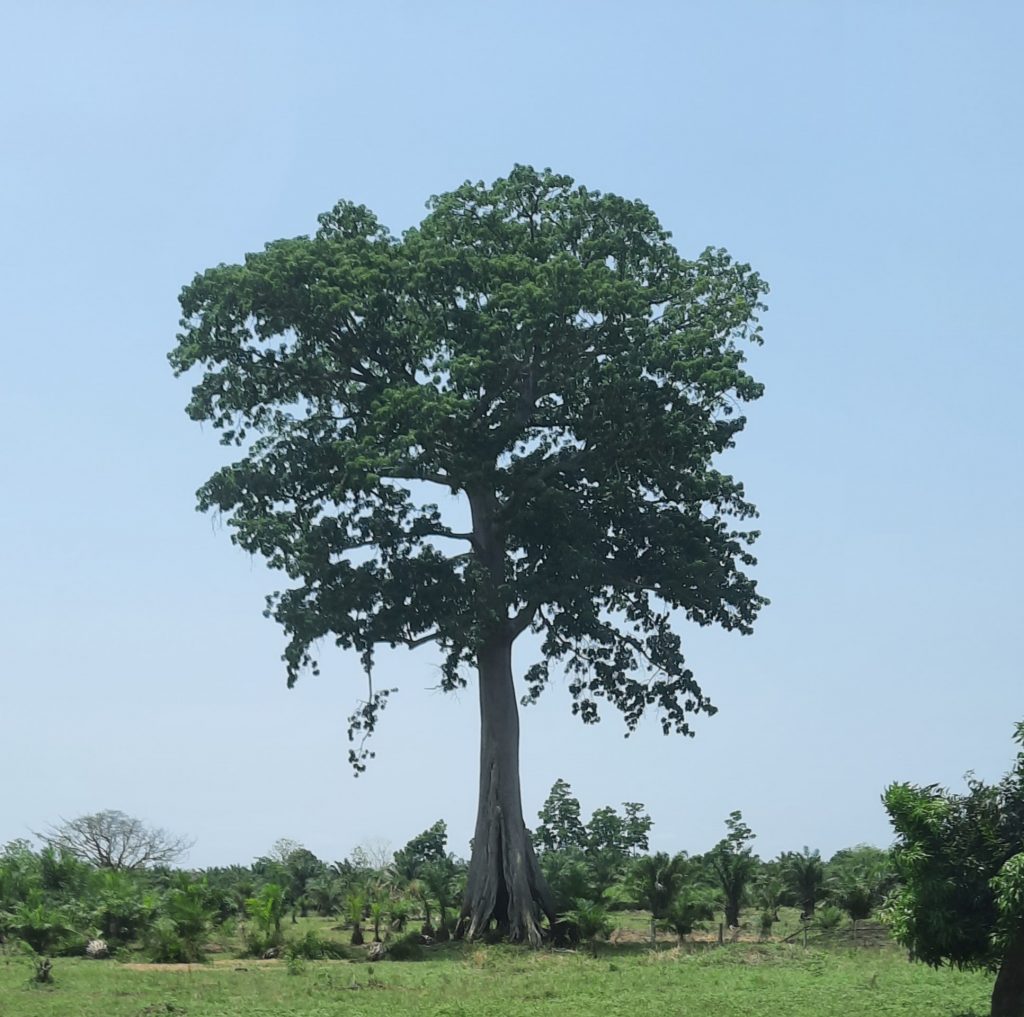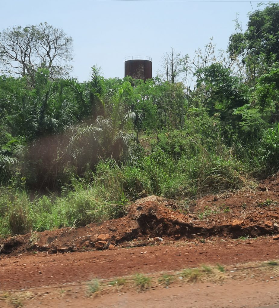 Auf der Fahrt erzählt uns Leon, dass früher hier sehr viel Kaffee und Kakao angebaut wurde. Kaffee und noch mehr Kakao benötigen für ein gutes Wachstum den Schatten von großen Bäumen. Große Firmen haben den Leuten erzählt es gäbe jetzt Züchtungen von Bäumen, die auf dem freien Land wachsen und sehr ertragreich wären. So wurden die großen Schattenbäume gefällt und die neuen Kaffee – und Kakaobäume gepflanzt. Leider stellte sich der Erfolg nicht ein. Auf großen Teilen der Flächen wurden dann Ölpalmen gepflanzt, die aber auch nicht den gewünschten Erfolg brachten, da der Boden teilweise total überdüngt war und die Palmbäume nicht den erwarteden Ertrag abwarfen. Die Qualität der Palmnüsse war auch nicht gut und so wurde in der eigens erbauten Palmölfabrik irgendwann die Ölproduktion wieder eingestellt. Die Kleinbauern der Region haben dann versucht Sodabie (traditioneller Schnaps) zu produzieren. Wegen der Überdüngung erbeuteten sie aber auch nur eine minderwertige Qualität.